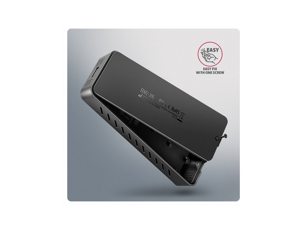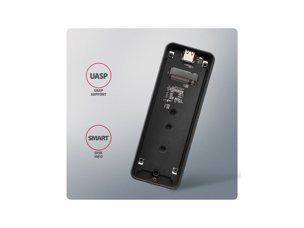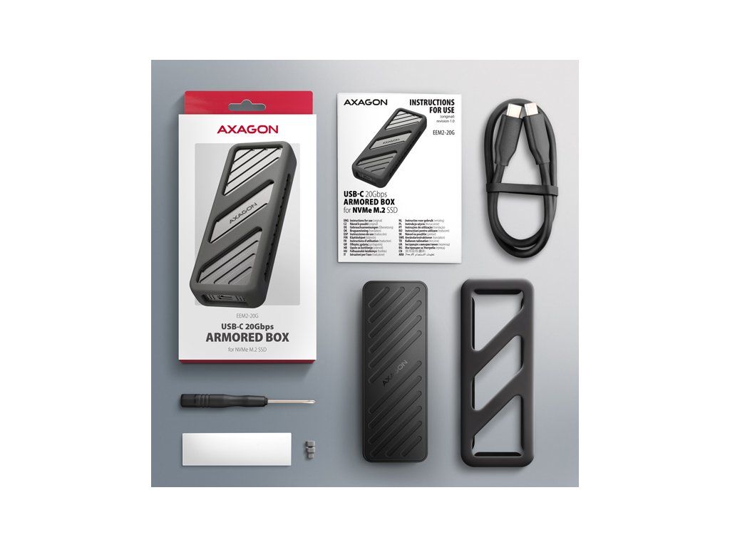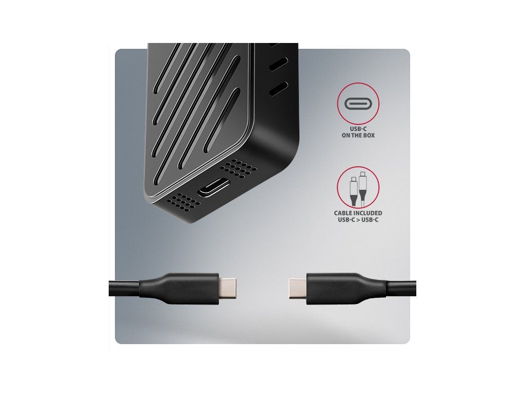 Rychlý externí AXAGON EEM2-20G ARMORED box s USB 20Gbps rozhraním určený pro M.2 NVMe SSD disky. Spolehlivé připojení umožňuje oboustranný USB-C konektor na boxu. V balení naleznete kabel USB-C -> USB-C pro připojení boxu k počítači. Díky USB 20Gbps rozhraní je přenosová rychlost až 20 Gb/s. Pro plné využití rychlosti boxu musí být řadič připojeného zařízení kompatibilní s USB 3.2 Gen 2x2. Tyto řadiče se obvykle používají v herních noteboocích a moderních stolních počítačích. Externí M.2 box podporuje i další moderní funkce např. UASP, TRIM a umožňuje čtení S.M.A.R.T. informací monitorujících stav disku. Podpora úsporného režimu při nečinnosti. Výhodou boxu je uchycení rovnou pro čtyři různé délky SSD disku - 30, 42, 60 a 80 mm. M.2 disky mohou být jednostranné nebo oboustranné. Box nemá omezení kapacity vloženého SSD disku. Otevírání boxu pomocí jediného šroubku usnadňuje montáž i demontáž M.2 SSD disku. Výměna disků je rychlá a snadná a rozšiřuje tak možnosti využití boxu např. pro migraci dat, testování atd. Hliníkové tělo boxu a teplovodivá podložka zajistí velmi dobré chlazení vloženého M.2 SSD disku. Průduchy na bočních stranách zajišťují dostatečnou cirkulaci vzduchu. Prodlužuje se tak jeho životnost a také je zamezeno zpomalování rychlosti disku tzv. „Thermal Throttling“. Dalším přínosem je silikonový návlek, který zajišťuje lepší ochranu boxu proti nárazům, zabraňuje klouzání po stole a zajišťuje pohodlné držení v ruce. Vnější kovový plášť je proveden v černé barvě s elegantním povrchem, který brání nežádoucím otiskům prstů. Vložením M.2 SSD disku do tohoto boxu snadno vytvoříte rychlý a univerzální externí disk. Box je možné použít jak s počítači a notebooky, tak s mobilními telefony a tablety. Vstup: • USB 20Gbps (USB 3.2 Gen 2x2), konektor USB-C female. • Kompatibilní s USB 5Gbps, USB 10Gbps. Podpora zařízení: • NVMe M.2 SSD disky, • určeno pro karty formátu M key nebo B+M key, • NGFF 75-pinový M key slot pro M.2 disky. Maximální teoretické podporované rychlosti a kompatibilita s USB řadiči (porty): • Notebook / PC s USB 20Gbps (USB 3.2 Gen 2x2) portem: max. rychlost 20 Gbit/s. • Notebook / PC s USB 10Gbps (USB 3.2 Gen 2) portem: max. rychlost 10 Gbit/s. • Notebook / PC s USB 5Gbps (USB 3.2 Gen 1 / USB 3.0) portem: max. rychlost 5 Gbit/s. • Kompatibilita s USB4, Thunderbolt 3/4 porty: max. rychlost 10 Gbit/s. • Reálná propustnost / přenosová rychlost boxu kolem 2000 MB/s (2 GB/s) je dána limity USB 3.2 Gen 2x2 rozhraní. Další vlastnosti: • Podpora přenosových rychlostí 20.000 / 10.000 / 5.000 Mbit/s. • Podpora M key nebo B+M key NVMe (PCI-Express) M.2 SSD disků bez omezení maximální kapacity. • Podpora M.2 disků rozměrů - 2230, 2242, 2260, 2280 mm. • Podpora jednostranných i oboustranných M.2 SSD disků. • Vyhovuje PCI Express Base Specification Revision 3.1a specifikaci. • Vyhovuje NVM Express 1.3c specifikaci. • Vyhovuje USB Mass Storage Class specifikaci. • Podpora BOT (Bulk-Only Transport). • Podpora UASP (USB Attached SCSI) pro rychlejší přenos dat ve Windows 8 a novějších. • Podpora funkce TRIM pro omezení pozvolné degradace výkonu SSD v čase. • Podpora S.M.A.R.T. (Self-Monitoring, Analysis, and Reporting Technology) systém monitorující stav disku. • Podpora bootování z SSD v externím boxu. • Možnost připojení zařízení za chodu díky podpoře Hot Plug. • Plná podpora Plug and Play. • Napájení po USB sběrnici až 900mA z jednoho USB portu zcela dostačuje ve všech případech. • Decentní modrá LED dioda indikující připojení k USB portu počítače (trvalým svitem) a přenos dat (blikáním). • Hliníkové odolné tělo a teplovodivá podložka napomáhají lepšímu chlazení M.2 SSD disku. • Vyšší povrchová teplota boxu není závadou - díky hliníkovému tělu je teplo generované provozem disku lépe odváděno a předáváno do okolí. • Připojení přes USB 3.2 Gen 2x2 type C female konektor. • Kabel USB type C male / USB type C male délky 38 cm je součástí balení. Další údaje: • Rozměry boxu 15 x 112 x 40 mm (V x Š x H). • Hmotnost boxu 83 g (bez kabelu, bez disku, bez návleku). Podporované operační systémy: • Windows 7 / 8.1 / 10 / 11 a novější, macOS, iPadOS, iOS, Linux, Chrome OS a Android. • Kompatibilita je závislá na aktualizovaném operačním systému a podpoře od výrobce zařízení. • Pozn.: Při použití s Windows 7 je nutné ověřit u výrobce M.2 SSD disku podporu tohoto OS a dostupnost ovladače. Balení v kartonové krabičce s otvorem pro zavěšení obsahuje: • USB-C 20Gbps externí box pro M.2 SSD, • silikonový návlek, • USB-C - USB-C kabel délky 38 cm, • 1ks teplovodivé podložky, • montážní materiál a šroubovák, • vícejazyčný návod CZ/DE/DK/ENG/ESP/FIN/FR/GR/HR/HU/IT/NL/PL/PT/RO/SK/SWE/TR/UA/BG/CN/ARA.Dodatočné parametre