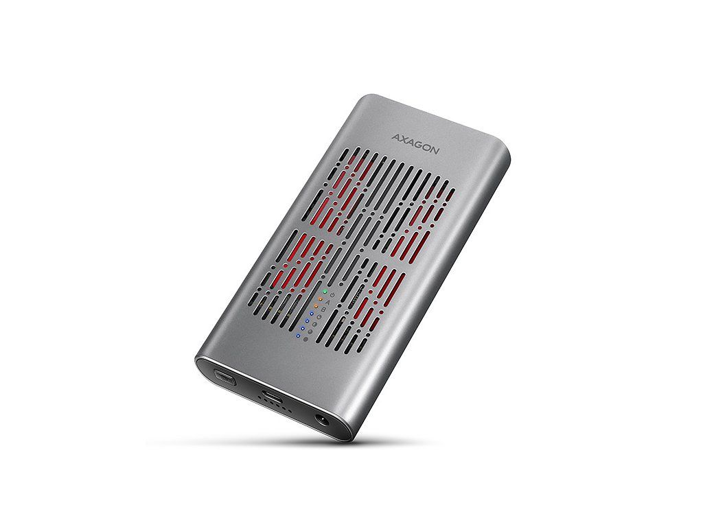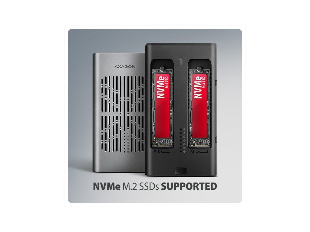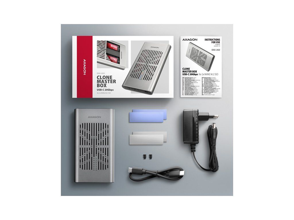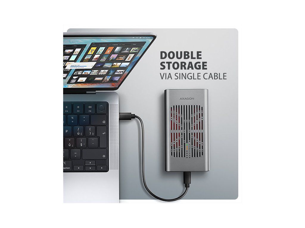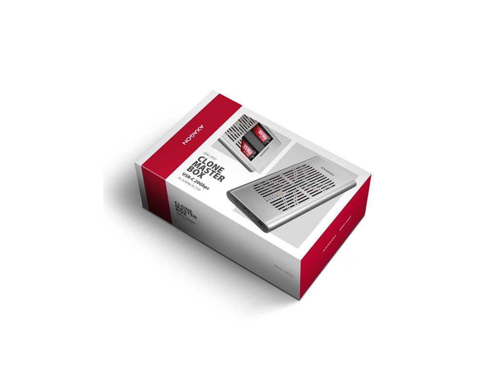 Rychlý externí box AXAGON EEM2-20GD CLONE MASTER s rozhraním USB 20Gbps. Box funguje nejen jako externí úložiště pro dva M.2 NVME SSD disky současně, ale také jako dokovací stanice, která umožňuje jednoduše klonovat M.2 disky bez použití počítače. Spolehlivé připojení umožňuje oboustranný USB-C konektor. Součástí balení je kabel USB-C -> USB-C pro připojení boxu k počítači. S externím boxem snadno naklonujete NVMe disky rychlostí až 20 Gb/s. Do prvního slotu stanice (Slot A) vložíte zdrojový M.2 disk a do druhého slotu (Slot B) cílový M.2 disk. Poté jen podržíte klonovací tlačítko, stiskem potvrdíte klonování a sledujete jeho průběh na stupnici se čtyřmi LED diodami. Po dokončení se na cílovém disku vytvoří přesná kopie původního. Box tak využijete i jako autonomní zařízení pro pohodlné duplikování a vytváření obrazů disků. Jedná se o nejjednodušší způsob, jak přenést obsah jednoho SSD na druhý, a to včetně funkčního operačního systému (Windows, macOS, Linux…). Provedení boxu umožňuje připojit oba vložené NVMe M.2 disky k notebooku jediným kabelem. V systému se zobrazí jako dva samostatné disky, se kterými můžete pracovat nezávisle nebo i současně. Konstrukce boxu při použití dvou disků umožňuje nastavit softwarový RAID pro vyšší ochranu dat ve Windows i macOS. Pro konfiguraci této ochrany využijte nástroj „Prostory úložišť“ ve Windows nebo „RAID asistent“ v Diskové utilitě v macOS. Abyste dosáhli maximální přenosové rychlosti, musí být řadič připojeného zařízení kompatibilní s USB 20Gbps. Externí M.2 box podporuje i další moderní funkce např. UASP, TRIM a umožňuje čtení S.M.A.R.T. informací monitorujících stav disku. Při delší nečinnosti se přepne do úsporného režimu, čímž šetří energii. Výhodou také je, že do ně vložíte jednostranné i oboustranné M.2 SSD o třech různých délkách (42, 60 a 80 mm). Kapacita SSD disků není nijak omezena. Proti náhodnému otevření chrání box mechanický zámek na předním panelu. Po posunutí zámku do odemčené polohy zatlačte na čelní část a vnitřní modul se automaticky vysune. Díky tomu disky snadno a rychle vyměníte a můžete box pohodlně využít i pro migraci dat nebo testování. Hliníkové tělo boxu společně s teplovodivými podložkami odvádí teplo z vložených M.2 SSD disků. Chlazení podporuje i aktivní ventilátor, díky kterému nepřetržitě proudí vzduch uvnitř zařízení. Tím se udržuje optimální provozní teplota při dlouhodobé zátěži (například při klonování nebo přenosu velkých objemů dat). Riziko přehřívání a zpomalování disků vlivem tzv. „Thermal Throttling“ je tak minimální. To stabilizuje výkon a prodlouží životnost vašim SSD. Vložením M.2 SSD do tohoto boxu snadno vytvoříte rychlý a univerzální externí disk 2in1. Box využijete s počítači, notebooky, mobilními telefony i tablety. Vstup: • USB 20Gbps (USB 3.2 Gen 2x2), konektor USB-C female. • Kompatibilní s USB 5Gbps, USB 10Gbps, USB 40Gbps, Thunderbolt 3/4/5. Podpora zařízení: • 2x NVMe M.2 SSD disky, • určeno pro karty formátu M key nebo B+M key, • 2x NGFF 75-pinový M key slot pro M.2 disky. Funkce klonování obsahu disku: • Klonování probíhá bez připojení stanice k počítači. • Cílový disk musí mít stejnou nebo větší kapacitu než zdrojový disk, jinak nelze klonování spustit. • Rychlost klonování SSD až 2000 MB/s. • Celkový čas naklonování disku závisí na rychlosti použitých disků a kapacitě zdrojového disku, ne na objemu dat na disku. Maximální teoretické podporované rychlosti a kompatibilita s USB řadiči (porty): • Notebook / PC s USB 20Gbps (USB 3.2 Gen 2x2) portem: max. rychlost 20 Gbit/s. • Notebook / PC s USB 10Gbps (USB 3.2 Gen 2) portem: max. rychlost 10 Gbit/s. • Notebook / PC s USB 5Gbps (USB 3.2 Gen 1 / USB 3.0) portem: max. rychlost 5 Gbit/s. • Kompatibilita s USB 40Gbps, Thunderbolt 3/4/5 porty: max. rychlost 10 až 20 Gbit/s, a to v závislosti na užitém procesoru a čipové sadě. • Reálná propustnost / přenosová rychlost boxu kolem 2000 MB/s (2 GB/s) je dána limity USB 3.2 Gen 2x2 rozhraní. Další vlastnosti: • Podpora přenosových rychlostí 20.000 / 10.000 / 5.000 Mbit/s. • Podpora M key nebo B+M key NVMe (PCI Express) M.2 SSD disků bez omezení maximální kapacity. • Podpora M.2 disků rozměrů - 2242, 2260, 2280 mm. • Podpora jednostranných i oboustranných M.2 SSD disků. • Vyhovuje PCI Express Base Specification Revision 3.1a specifikaci. • Vyhovuje NVM Express 1.4 specifikaci. • Vyhovuje USB Mass Storage Class specifikaci. • Podpora BOT (Bulk-Only Transport). • Podpora UASP (USB Attached SCSI) pro rychlejší přenos dat ve Windows 8 a novějších. • Podpora funkce TRIM pro omezení pozvolné degradace výkonu SSD v čase. • Podpora S.M.A.R.T. (Self-Monitoring, Analysis, and Reporting Technology) systém monitorující stav disku. • Podpora bootování z SSD v externím boxu. • Možnost připojení zařízení za chodu díky podpoře Hot Plug. • Plná podpora Plug and Play. • Napájení po USB sběrnici až 900 mA z jednoho USB portu zcela dostačuje ve všech případech. • Hliníkové odolné tělo a teplovodivé podložky napomáhají lepšímu chlazení M.2 SSD disku. • Aktivní chlazení pomocí integrovaného ventilátoru. • Mechanický zámek vnitřního modulu na předním panelu. • Vyšší povrchová teplota boxu není závadou – díky hliníkovému tělu je teplo generované provozem disku lépe odváděno a předáváno do okolí. • Připojení přes USB 3.2 Gen 2x2 type C female konektor. • Kabel USB type C male / USB type C male délky 30 cm je součástí balení. • Kompatibilní se softwarovým Windows RAID (Prostory úložišť) a macOS