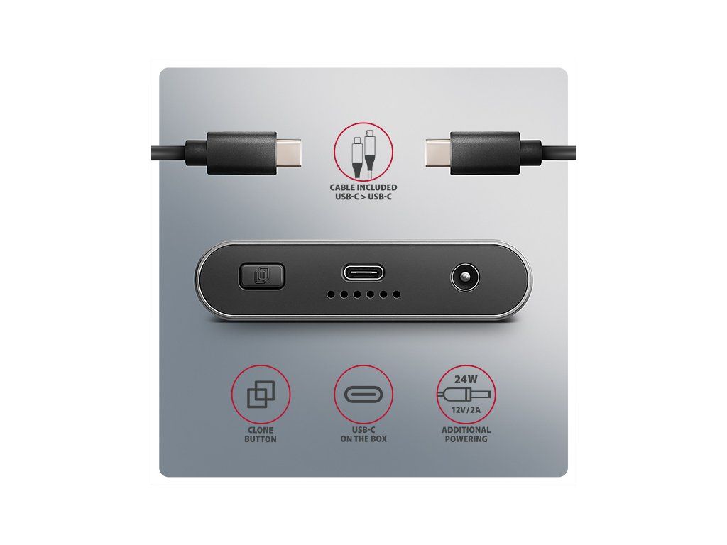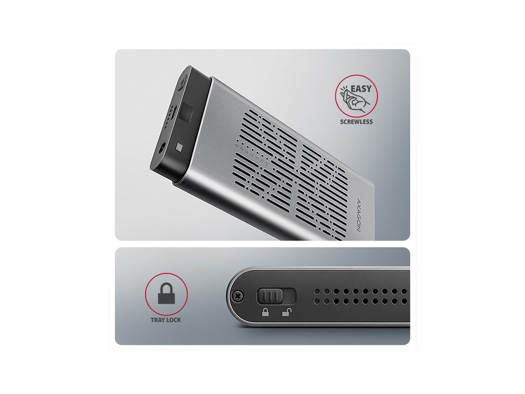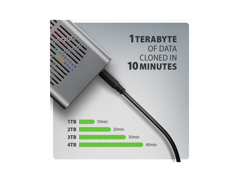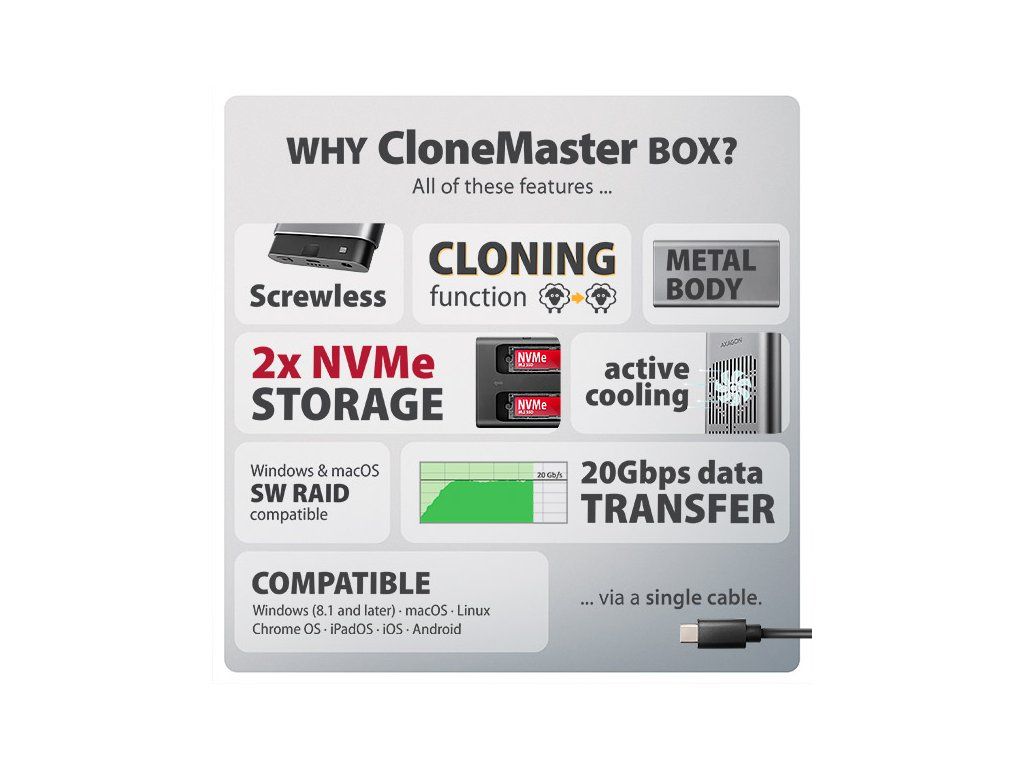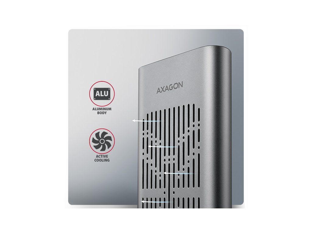 Rychlý externí box AXAGON EEM2-20GD CLONE MASTER s rozhraním USB 20Gbps. Box funguje nejen jako externí úložiště pro dva M.2 NVME SSD disky současně, ale také jako dokovací stanice, která umožňuje jednoduše klonovat M.2 disky bez použití počítače. Spolehlivé připojení umožňuje oboustranný USB-C konektor. Součástí balení je kabel USB-C -> USB-C pro připojení boxu k počítači. S externím boxem snadno naklonujete NVMe disky rychlostí až 20 Gb/s. Do prvního slotu stanice (Slot A) vložíte zdrojový M.2 disk a do druhého slotu (Slot B) cílový M.2 disk. Poté jen podržíte klonovací tlačítko, stiskem potvrdíte klonování a sledujete jeho průběh na stupnici se čtyřmi LED diodami. Po dokončení se na cílovém disku vytvoří přesná kopie původního. Box tak využijete i jako autonomní zařízení pro pohodlné duplikování a vytváření obrazů disků. Jedná se o nejjednodušší způsob, jak přenést obsah jednoho SSD na druhý, a to včetně funkčního operačního systému (Windows, macOS, Linux…). Provedení boxu umožňuje připojit oba vložené NVMe M.2 disky k notebooku jediným kabelem. V systému se zobrazí jako dva samostatné disky, se kterými můžete pracovat nezávisle nebo i současně. Konstrukce boxu při použití dvou disků umožňuje nastavit softwarový RAID pro vyšší ochranu dat ve Windows i macOS. Pro konfiguraci této ochrany využijte nástroj „Prostory úložišť“ ve Windows nebo „RAID asistent“ v Diskové utilitě v macOS. Abyste dosáhli maximální přenosové rychlosti, musí být řadič připojeného zařízení kompatibilní s USB 20Gbps. Externí M.2 box podporuje i další moderní funkce např. UASP, TRIM a umožňuje čtení S.M.A.R.T. informací monitorujících stav disku. Při delší nečinnosti se přepne do úsporného režimu, čímž šetří energii. Výhodou také je, že do ně vložíte jednostranné i oboustranné M.2 SSD o třech různých délkách (42, 60 a 80 mm). Kapacita SSD disků není nijak omezena. Proti náhodnému otevření chrání box mechanický zámek na předním panelu. Po posunutí zámku do odemčené polohy zatlačte na čelní část a vnitřní modul se automaticky vysune. Díky tomu disky snadno a rychle vyměníte a můžete box pohodlně využít i pro migraci dat nebo testování. Hliníkové tělo boxu společně s teplovodivými podložkami odvádí teplo z vložených M.2 SSD disků. Chlazení podporuje i aktivní ventilátor, díky kterému nepřetržitě proudí vzduch uvnitř zařízení. Tím se udržuje optimální provozní teplota při dlouhodobé zátěži (například při klonování nebo přenosu velkých objemů dat). Riziko přehřívání a zpomalování disků vlivem tzv. „Thermal Throttling“ je tak minimální. To stabilizuje výkon a prodlouží životnost vašim SSD. Vložením M.2 SSD do tohoto boxu snadno vytvoříte rychlý a univerzální externí disk 2in1. Box využijete s počítači, notebooky, mobilními telefony i tablety. Vstup: • USB 20Gbps (USB 3.2 Gen 2x2), konektor USB-C female. • Kompatibilní s USB 5Gbps, USB 10Gbps, USB 40Gbps, Thunderbolt 3/4/5. Podpora zařízení: • 2x NVMe M.2 SSD disky, • určeno pro karty formátu M key nebo B+M key, • 2x NGFF 75-pinový M key slot pro M.2 disky. Funkce klonování obsahu disku: • Klonování probíhá bez připojení stanice k počítači. • Cílový disk musí mít stejnou nebo větší kapacitu než zdrojový disk, jinak nelze klonování spustit. • Rychlost klonování SSD až 2000 MB/s. • Celkový čas naklonování disku závisí na rychlosti použitých disků a kapacitě zdrojového disku, ne na objemu dat na disku. Maximální teoretické podporované rychlosti a kompatibilita s USB řadiči (porty): • Notebook / PC s USB 20Gbps (USB 3.2 Gen 2x2) portem: max. rychlost 20 Gbit/s. • Notebook / PC s USB 10Gbps (USB 3.2 Gen 2) portem: max. rychlost 10 Gbit/s. • Notebook / PC s USB 5Gbps (USB 3.2 Gen 1 / USB 3.0) portem: max. rychlost 5 Gbit/s. • Kompatibilita s USB 40Gbps, Thunderbolt 3/4/5 porty: max. rychlost 10 až 20 Gbit/s, a to v závislosti na užitém procesoru a čipové sadě. • Reálná propustnost / přenosová rychlost boxu kolem 2000 MB/s (2 GB/s) je dána limity USB 3.2 Gen 2x2 rozhraní. Další vlastnosti: • Podpora přenosových rychlostí 20.000 / 10.000 / 5.000 Mbit/s. • Podpora M key nebo B+M key NVMe (PCI Express) M.2 SSD disků bez omezení maximální kapacity. • Podpora M.2 disků rozměrů - 2242, 2260, 2280 mm. • Podpora jednostranných i oboustranných M.2 SSD disků. • Vyhovuje PCI Express Base Specification Revision 3.1a specifikaci. • Vyhovuje NVM Express 1.4 specifikaci. • Vyhovuje USB Mass Storage Class specifikaci. • Podpora BOT (Bulk-Only Transport). • Podpora UASP (USB Attached SCSI) pro rychlejší přenos dat ve Windows 8 a novějších. • Podpora funkce TRIM pro omezení pozvolné degradace výkonu SSD v čase. • Podpora S.M.A.R.T. (Self-Monitoring, Analysis, and Reporting Technology) systém monitorující stav disku. • Podpora bootování z SSD v externím boxu. • Možnost připojení zařízení za chodu díky podpoře Hot Plug. • Plná podpora Plug and Play. • Napájení po USB sběrnici až 900 mA z jednoho USB portu zcela dostačuje ve všech případech. • Hliníkové odolné tělo a teplovodivé podložky napomáhají lepšímu chlazení M.2 SSD disku. • Aktivní chlazení pomocí integrovaného ventilátoru. • Mechanický zámek vnitřního modulu na předním panelu. • Vyšší povrchová teplota boxu není závadou – díky hliníkovému tělu je teplo generované provozem disku lépe odváděno a předáváno do okolí. • Připojení přes USB 3.2 Gen 2x2 type C female konektor. • Kabel USB type C male / USB type C male délky 30 cm je součástí balení. • Kompatibilní se softwarovým Windows RAID (Prostory úložišť) a macOS