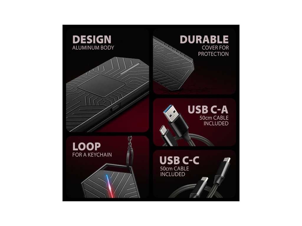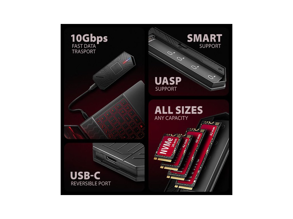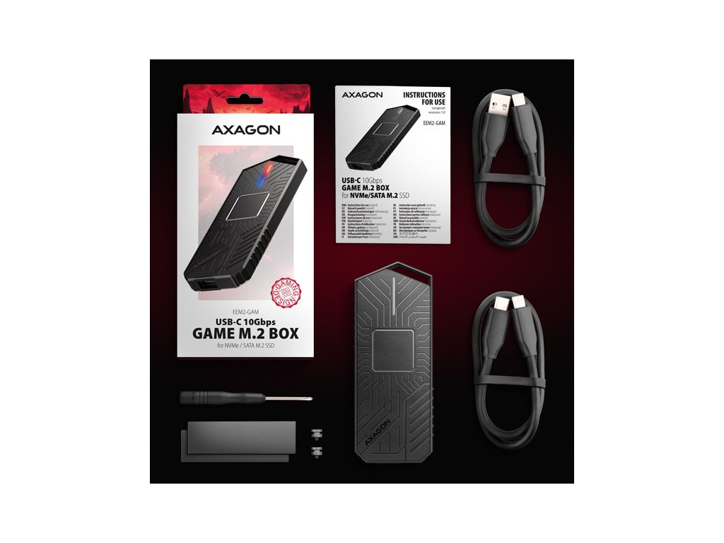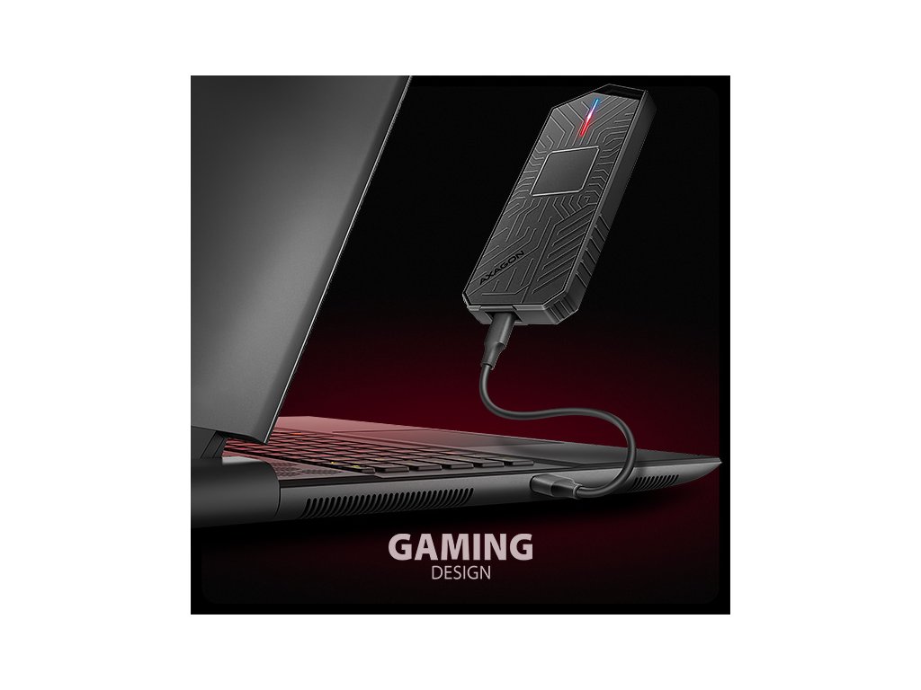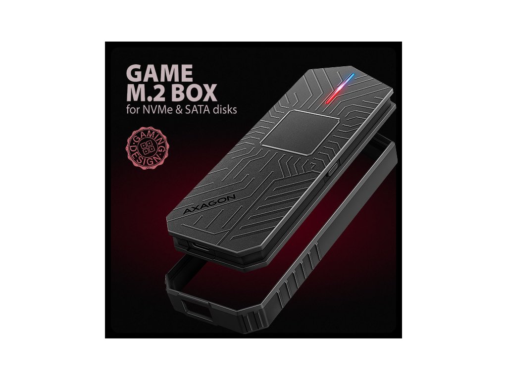 Gamingový externí AXAGON EEM2-GAM GAME M.2 box s USB 10Gbps rozhraním určený pro M.2 NVMe nebo SATA SSD disky. Spolehlivé připojení umožňuje oboustranný USB-C konektor na boxu. V balení naleznete dva kabely pro připojení boxu k počítači. Jeden USB-C <-> USB-C a druhý USB-C <-> USB-A. Můžete tak box připojit k jakémukoliv volnému USB portu na notebooku. Díky USB 3.2 Gen 2 rozhraní je přenosová rychlost až 10 Gb/s. Externí M.2 box podporuje i další moderní funkce např. UASP, TRIM a umožňuje čtení S.M.A.R.T. informací monitorujících stav disku. Unikátní vlastností, díky použitému čipsetu, je možnost použití jak M.2 NVMe tak i SATA disků. Nemusíte tak přemýšlet jaký typ M.2 disku do boxu vložíte. Výhodou je uchycení rovnou pro čtyři různé délky SSD karet – 30, 42, 60 a 80 mm. M.2 karty mohou být jednostranné nebo oboustranné. Box nemá omezení kapacity vloženého SSD disku. Velkou výhodou je bezšroubkové otevírání boxu. Stačí jen stisknout tlačítko umístěné na boku, čímž se odjistí spodní kryt. Výměna disků je tak snadná a rychlá. Stylový rámeček pro M.2 disky vás zaujme prémiovým herním designem v černé barvě s elegantním povrchem, který dokonale podtrhne váš gaming setup. RGB LED indikace dodává stylový vzhled a dokonale ladí s jakýmkoliv herním notebookem, čímž ještě více umocňuje atmosféru vašeho herního prostředí. Součástí balení je také funkční návlek, který chrání tlačítko pro otevírání boxu, zvyšuje celkovou ochranu, a navíc nabízí poutko pro zavěšení. Hliníkové tělo boxu a teplovodivá podložka zajišťují ideální chlazení vloženého M.2 SSD disku. Tím se prodlužuje jeho životnost a zároveň se předchází zpomalování rychlosti disku, tzv. Thermal Throttling. Vložením M.2 SSD disku do tohoto boxu snadno vytvoříte rychlý, kompaktní a univerzální externí disk, který je možné použít nejen s počítači a notebooky, ale také s mobilními telefony a tablety. Vstup: • USB 10Gbps (USB 3.2 Gen 2), konektor USB-C female. • Kompatibilní s USB 480Mbps, USB 5Gbps, USB4 a Thunderbolt 3/4. Podpora zařízení: • NVMe M.2 SSD disky, • SATA M.2 SSD disky, • určeno pro karty formátu M key nebo B+M key, • NGFF 75-pinový M key slot pro M.2 disky. Další vlastnosti: • Podpora přenosových rychlostí 10.000 / 5.000 / 480 Mbit/s. • Podpora M key nebo B+M key NVMe (PCI-Express) i SATA (AHCI) M.2 SSD disků bez omezení maximální kapacity. • Podpora M.2 disků rozměrů - 2230, 2242, 2260, 2280 mm. • Podpora jednostranných i oboustranných M.2 SSD disků. • Vyhovuje PCI Express Base Specification Revision 3.1a specifikaci. • Vyhovuje NVM Express 1.3 specifikaci. • Vyhovuje Serial ATA 3.2 specifikaci (SATA/600), přenosové rychlosti až 6 Gb/s (600 MB/s). • Vyhovuje USB Mass Storage Class specifikaci. • Celková propustnost / přenosová rychlost adaptéru je dána použitým USB rozhraním (teoreticky až 10 Gbit/s). • Reálná propustnost / přenosová rychlost adaptéru kolem 1000 MB/s (1 GB/s) je dána limity USB 3.2 Gen 2 rozhraní. • Podpora BOT (Bulk-Only Transport). • Podpora UASP (USB Attached SCSI) pro rychlejší přenos dat ve Windows 8 a novějších. • Podpora funkce TRIM pro omezení pozvolné degradace výkonu SSD v čase. • Podpora S.M.A.R.T. (Self-Monitoring, Analysis, and Reporting Technology) systém monitorující stav disku. • Podpora bootování z SSD v externím boxu. • Možnost připojení zařízení za chodu díky podpoře Hot Plug. • Plná podpora Plug and Play. • Napájení po USB sběrnici až 900mA z jednoho USB portu zcela dostačuje ve všech případech. • RGB LED indikace. • Hliníkové odolné tělo a teplovodivá podložka napomáhají lepšímu chlazení M.2 SSD disku. • Vyšší povrchová teplota boxu není závadou - díky hliníkovému tělu je teplo generované provozem disku lépe odváděno a předáváno do okolí. • Dva kabely USB type C nebo A male / USB type C male, délky 50 cm jsou součástí balení. Další údaje: • Rozměry boxu 13 x 130 x 55 mm (V x Š x H). • Hmotnost boxu 105 g (bez kabelu a M.2 disku). Podporované operační systémy: • Windows 7 / 8.1 / 10 / 11 a novější, macOS, iPadOS, iOS, Linux, Chrome OS a Android. • Kompatibilita je závislá na aktualizovaném operačním systému a podpoře od výrobce zařízení. • Pozn.: Při použití s Windows 7 je nutné ověřit u výrobce M.2 SSD disku podporu tohoto OS a dostupnost ovladače. Balení v kartonové krabičce s otvorem pro zavěšení obsahuje: • USB-C 10Gbps externí box pro M.2 SSD, • ochranný návlek, • USB-C - USB-C kabel délky 50 cm, • USB-A - USB-C kabel délky 50 cm, • 2ks teplovodivých podložek, • vícejazyčný návod CZ/DE/DK/ENG/ESP/FIN/FR/GR/HR/HU/IT/NL/PL/PT/RO/SK/SWE/TR/UA/BG/CN/ARA.Dodatočné parametre
