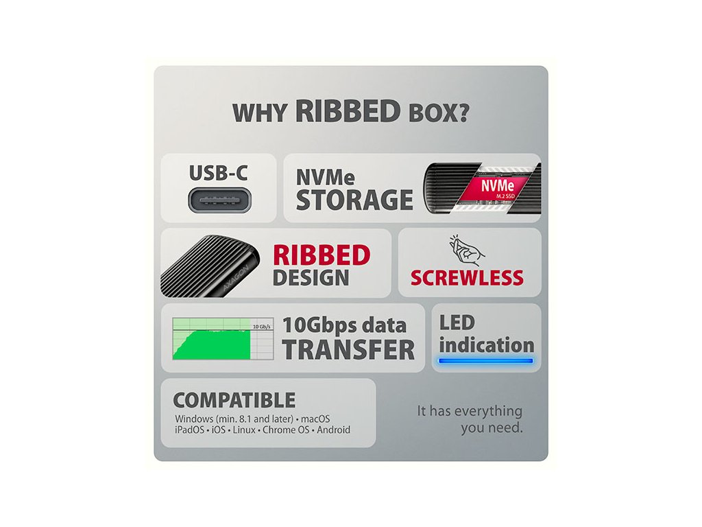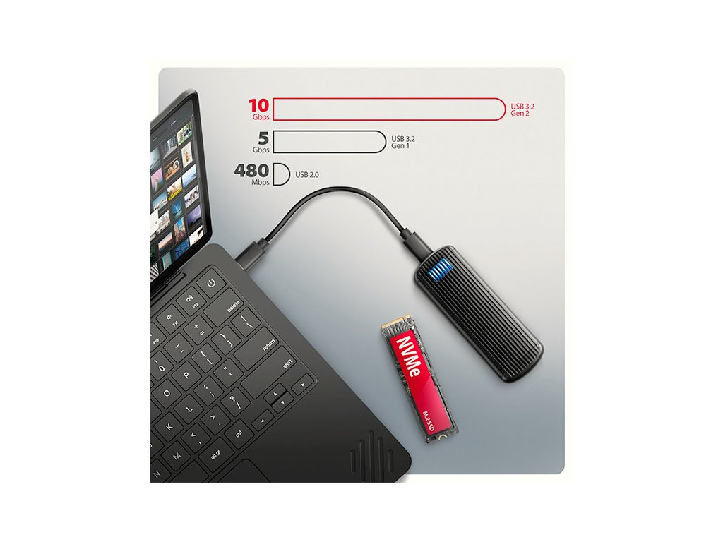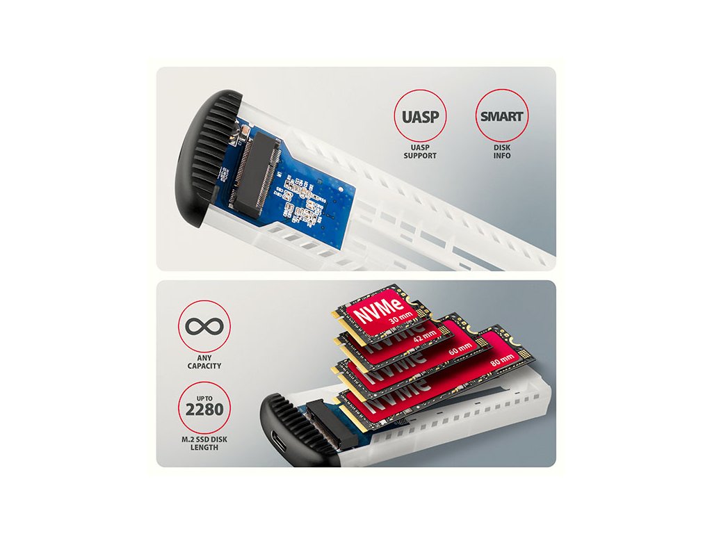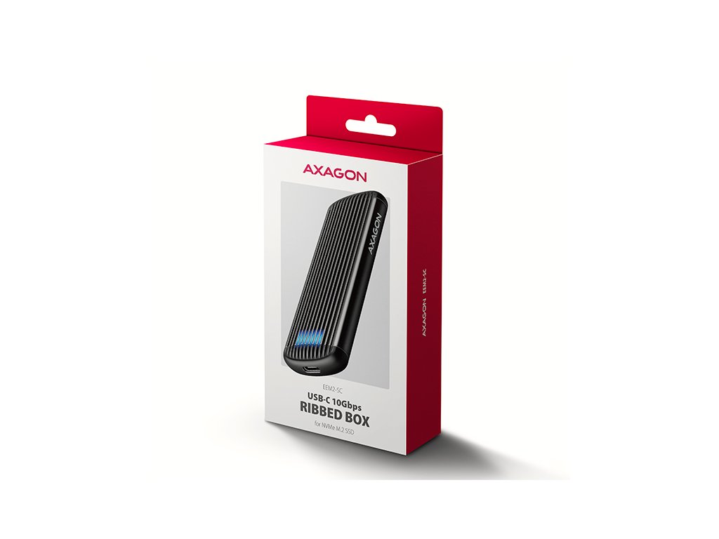 Hliníkový externí AXAGON EEM2-SC RIBBED box s USB 10Gbps rozhraním určený pro M.2 NVMe SSD disky. Stabilní a rychlé připojení zajišťuje oboustranný USB-C konektor. V balení naleznete kabel USB-C -> USB-C pro připojení boxu k počítači. Díky USB 10Gbps rozhraní je přenosová rychlost až 10 Gb/s. Externí M.2 box podporuje moderní funkce např. UASP, TRIM a umožňuje čtení S.M.A.R.T. informací monitorujících stav disku. Výhodou boxu je uchycení rovnou pro čtyři různé délky SSD disku - 30, 42, 60 a 80 mm. M.2 disky mohou být jednostranné nebo oboustranné. Box nemá omezení kapacity vloženého SSD disku. Bezšroubové otevírání usnadňuje montáž i demontáž M.2 SSD disku. Díky tomu je výměna disků rychlá a snadná a výrazně urychluje práci při migraci dat, testování, klonování či rozšiřování úložiště. Žebrovaný design a hliníkový plášť boxu zajistí velmi dobré chlazení vloženého M.2 SSD disku. Prodlužuje se tak jeho životnost a také je zamezeno zpomalování rychlosti disku tzv. „Thermal Throttling“. Vnější kovový plášť je proveden v černé barvě a brání nežádoucím otiskům prstů. Vložením M.2 SSD disku do tohoto boxu snadno vytvoříte rychlý a univerzální externí disk. Box je možné použít jak s počítači a notebooky, tak s mobilními telefony a tablety. Vstup: • USB 10Gbps (USB 3.2 Gen 2), konektor USB-C female. • Kompatibilní s USB 5Gbps, USB 20Gbps, USB 40Gbps a Thunderbolt 3/4/5. Podpora zařízení: • NVMe M.2 SSD disky, • určeno pro karty formátu M key nebo B+M key, • NGFF 75-pinový M key slot pro M.2 disky. Další vlastnosti: • Podpora přenosových rychlostí 10.000 / 5.000 Mbit/s. • Podpora NVMe (PCI Express) M.2 SSD disků bez omezení maximální kapacity. • Podpora M.2 disků rozměrů - 2230, 2242, 2260, 2280 mm. • Podpora jednostranných i oboustranných M.2 SSD disků. • Vyhovuje PCI Express Base Specification Revision 3.1a specifikaci. • Vyhovuje NVM Express 1.3 specifikaci. • Vyhovuje USB Mass Storage Class specifikaci. • Reálná propustnost / přenosová rychlost adaptéru kolem 1000 MB/s (1 GB/s) je dána limity USB 3.2 Gen 2 rozhraní. • Podpora BOT (Bulk-Only Transport). • Podpora UASP (USB Attached SCSI) pro rychlejší přenos dat ve Windows 8 a novějších. • Podpora funkce TRIM pro omezení pozvolné degradace výkonu SSD v čase. • Podpora S.M.A.R.T. (Self-Monitoring, Analysis, and Reporting Technology) systém monitorující stav disku. • Podpora bootování z SSD v externím boxu. • Možnost připojení zařízení za chodu díky podpoře Hot Plug. • Plná podpora Plug and Play. • Napájení po USB sběrnici až 900mA z jednoho USB portu zcela dostačuje ve všech případech. • Modré LED diody indikující připojení k USB portu počítače (trvalým svitem) a přenos dat (blikáním). • Hliníkové odolné tělo a teplovodivá podložka napomáhají lepšímu chlazení M.2 SSD disku. • Vyšší povrchová teplota boxu není závadou - díky hliníkovému tělu je teplo generované provozem disku lépe odváděno a předáváno do okolí. • Připojení přes USB 3.2 Gen 2 type C female konektor. • Kabel USB type C male / USB type C male délky 30 cm je součástí balení. Další údaje: • Rozměry 14 x 116 x 39 mm (V x Š x H). • Hmotnost 47 g (bez kabelu, bez disku). Podporované operační systémy: • Windows 7 / 8.1 / 10 / 11 a novější, macOS, iPadOS, iOS, Linux, Chrome OS a Android. • Kompatibilita je závislá na aktualizovaném operačním systému a podpoře od výrobce zařízení. • Pozn.: Při použití s Windows 7 je nutné ověřit u výrobce M.2 SSD disku podporu tohoto OS a dostupnost ovladače. Balení v kartonové krabičce s otvorem pro zavěšení obsahuje: • USB-C 10Gbps externí box pro M.2 SSD, • USB-C - USB-C kabel délky 30 cm, • 1ks teplovodivé podložky, • vícejazyčný návod CZ/DE/DK/ENG/ESP/EST/FIN/FR/GR/HR/HU/IT/LT/LV/NL/NOR/PL/PT/RO/SK/SLO/SRB/SWE/TR/UA/ALB/BG/BOS/CN/ARA.Dodatočné parametre