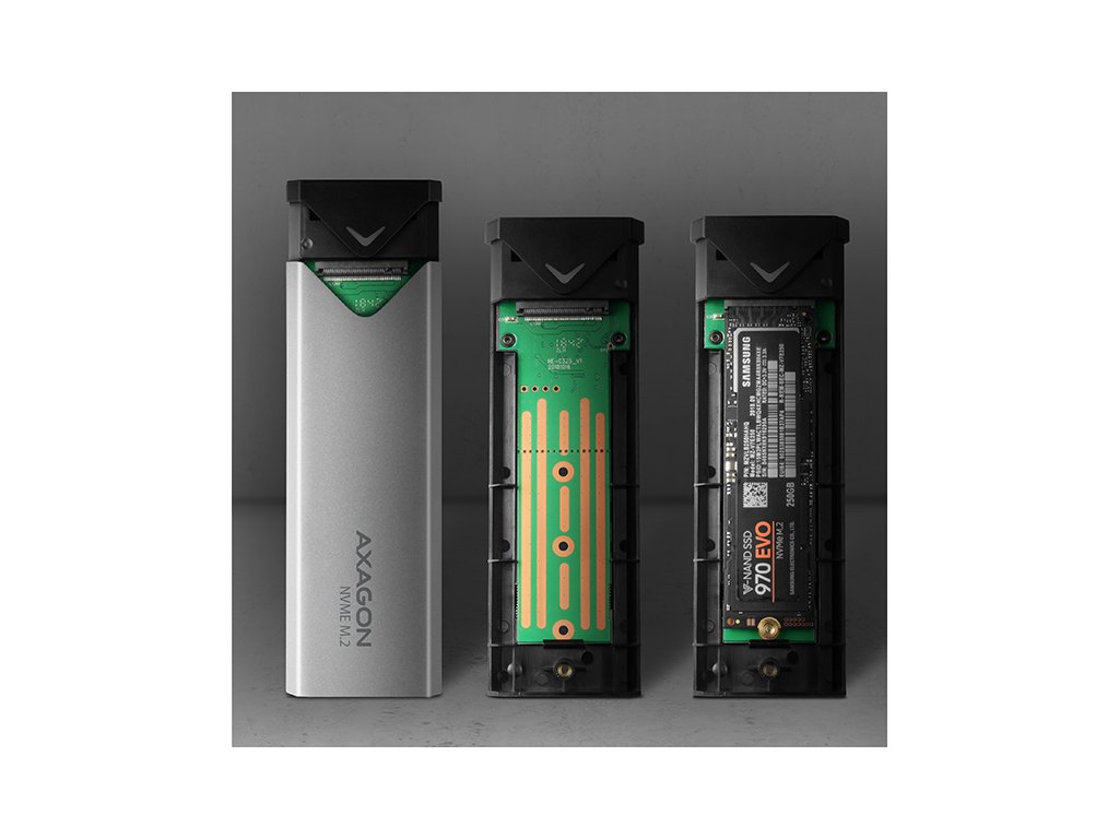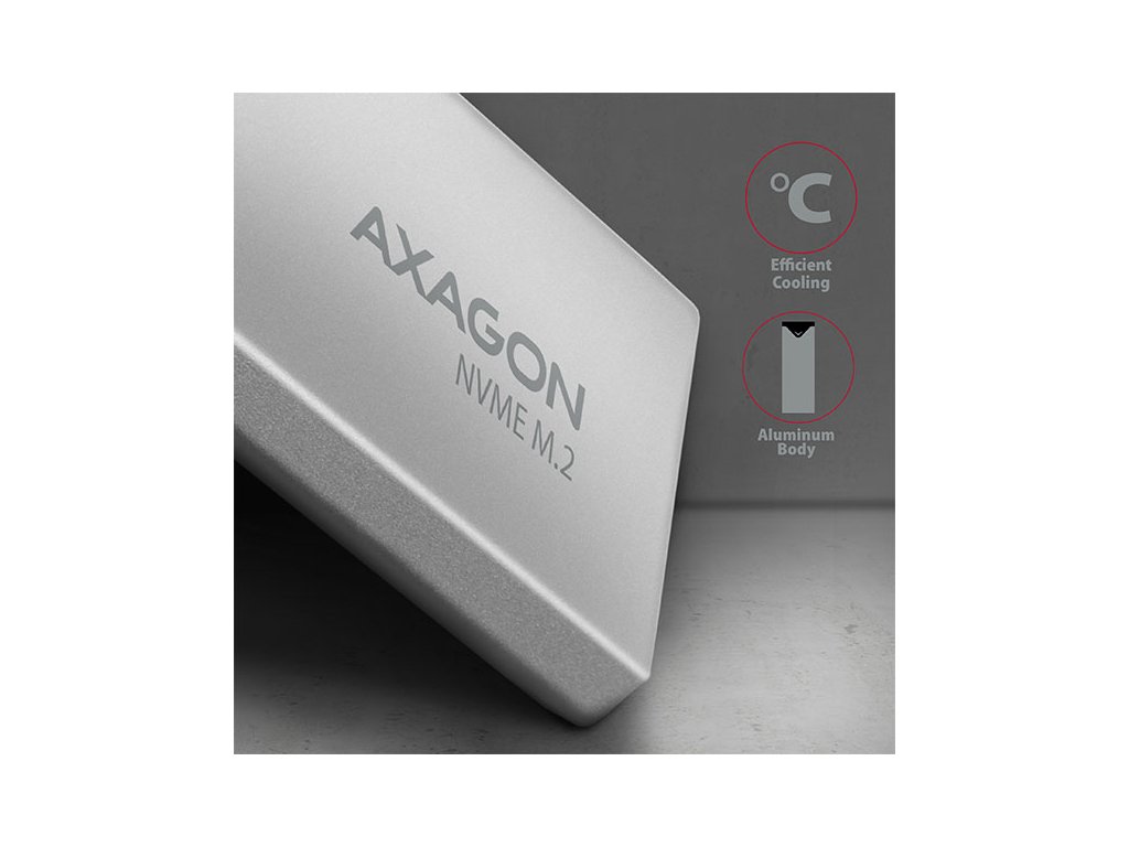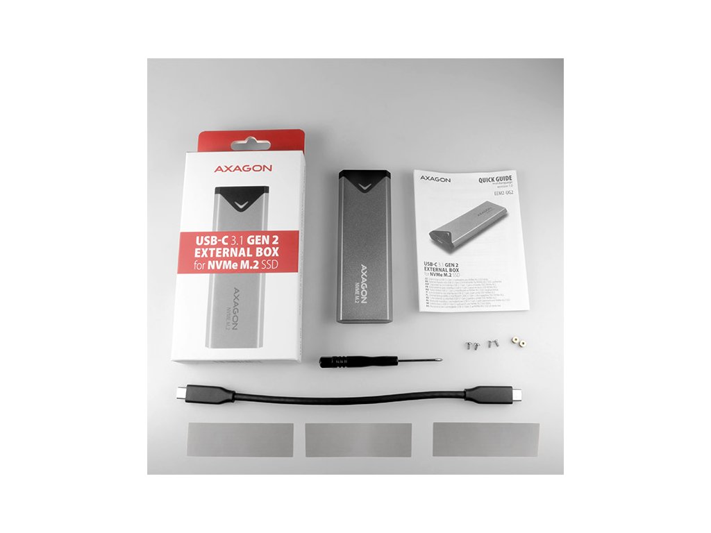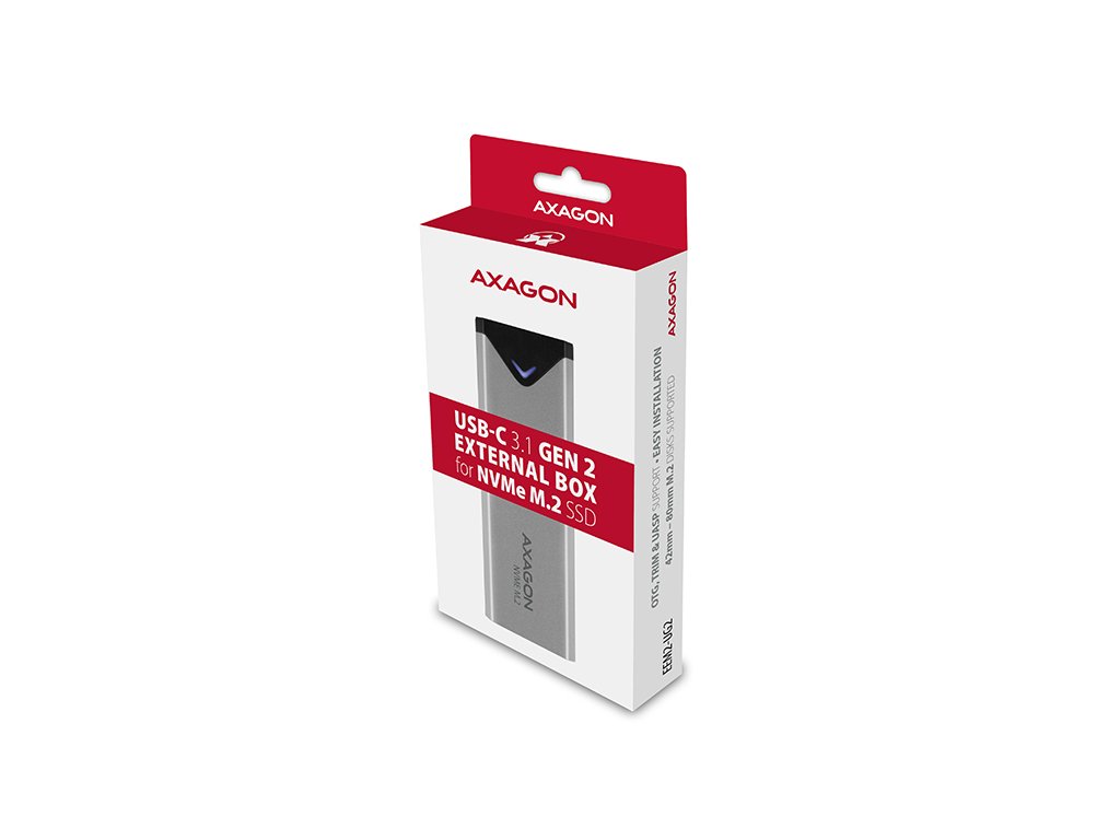Super rychlý externí box AXAGON EEM2-UG2 s USB 3.2 Gen 2 rozhraním je určen pro NVMe (PCI-Express) M.2 SSD disky. Nejnovější USB rozhraní dovolí užívat si rychlost moderních M.2 SSD disků. Díky rychlému USB 3.2 Gen 2 rozhraní je přenosová rychlost až 10Gb/s. Pohodlné připojení umožňuje oboustranný USB-C konektor. Externí M.2 box podporuje i další moderní funkce např. TRIM. Do externího boxu je možné použít NVMe M.2 SSD disky až do rozměru 22x80 mm. Box nemá omezení kapacity SSD disků. Karty M.2 mohou být jednostranné nebo oboustranné. Hliníkové tělo boxu a teplovodivé podložky zajistí velice dobré chlazení vloženého M.2 SSD disku. Vložením M.2 SSD disku do tohoto boxu snadno vytvoříte rychlý a kompaktní externí disk. Box je možné použít jak s počítači a notebooky, tak s mobilními telefony a tablety s podporou funkce OTG. Vstup: • USB 3.2 Gen 2 / SuperSpeed+ USB s rychlostí až 10 Gbit/s. • Připojení přes reverzibilní USB type C female konektor. Podpora zařízení: • NVMe M.2 SSD disky, • určeno pro karty formátu M-key nebo B+M key, • NGFF 75-pinový M-key slot pro NVMe M.2 disky. Další vlastnosti: • Kompatibilní s USB 3.2 Gen 2, zpětně kompatibilní s USB 3.1 Gen 1 / USB 3.0 a USB 2.0. • Podpora přenosových rychlostí 10.000 / 5000 / 480 Mbit/s (SuperSpeed 10 Gbps / SuperSpeed / HighSpeed). • Podpora M key nebo B+M key NVMe (PCI-Express) M.2 SSD disků bez omezení maximální kapacity. • Podpora M.2 disků rozměrů - 2242, 2260, 2280 mm. • Podpora jednostranných i oboustranných M.2 SSD disků. • Vyhovuje PCI Express Base Specification Revision 3.1a specifikaci. • Vyhovuje NVM Express 1.3 specifikaci. • Vyhovuje USB Mass Storage Class specifikaci. • Celková propustnost / přenosová rychlost boxu je dána použitým USB 3.2 Gen 2 rozhraním (teoreticky až 10 Gbit/s). • Reálná propustnost / přenosová rychlost boxu kolem 1000 MB/s (1 GB/s) je dána limity USB 3.2 Gen 2 rozhraním. • Podpora UASP (USB Attached SCSI) pro rychlejší přenos dat ve Windows 8 a novějších. • Podpora funkce TRIM pro omezení pozvolné degradace výkonu SSD v čase. • Podpora bootování z SSD v externím boxu. • Možnost připojení zařízení za chodu díky podpoře Hot Plug. • Plná podpora Plug and Play. • Podpora úsporného režimu - usínání disku po 5 minutách nečinnosti. • Napájení po USB sběrnici až 900mA z jednoho USB portu zcela dostačuje ve všech případech. • Decentní modrá LED dioda indikující připojení k USB portu počítače (trvalým svitem) a přenos dat (blikáním). • Hliníkové odolné tělo a teplovodivé podložky napomáhají lepšímu chlazení M.2 SSD disku. • Vyšší povrchová teplota boxu není závadou - díky hliníkovému tělu je teplo generované provozem disku lépe odváděno a předáváno do okolí. • Připojení přes USB 3.2 Gen 2 type C female konektor. • Kabel USB type C male / USB type C male délky 22 cm je součástí balení. Další údaje: • Rozměry externího boxu 115 x 39 x 11 mm. • Hmotnost externího boxu 43 g (bez USB kabelu a M.2 SSD disku). Podporované operační systémy: • MS Windows 7 / 8 / 8.1 / 10 a novější, Windows Server 2008 / 2012 / 2016 a novější (podporovány všechny 32- i 64-bitové verze OS Windows), Mac OS X 10.x a vyšší, Linux s jádrem 2.6.x a vyšším, Android (nutná podpora ze strany OS a zařízení). • Pozn.: Při použití s Windows 7 je nutné ověřit u výrobce M.2 SSD disku podporu tohoto OS a dostupnost ovladače. Balení v kartónové krabičce s přehledně uvedenými parametry obsahuje: • USB-C 3.2 Gen 2 externí box pro NVMe M.2 SSD, • USB type C – type C kabel délky 22 cm, • 3ks teplovodivých podložek, • montážní materiál a šroubovák, • tištěný instalační návod EN/CZ/DE/ESP/FR/HU/IT/PL/RO/RU/SK/BG.Dodatočné parametre