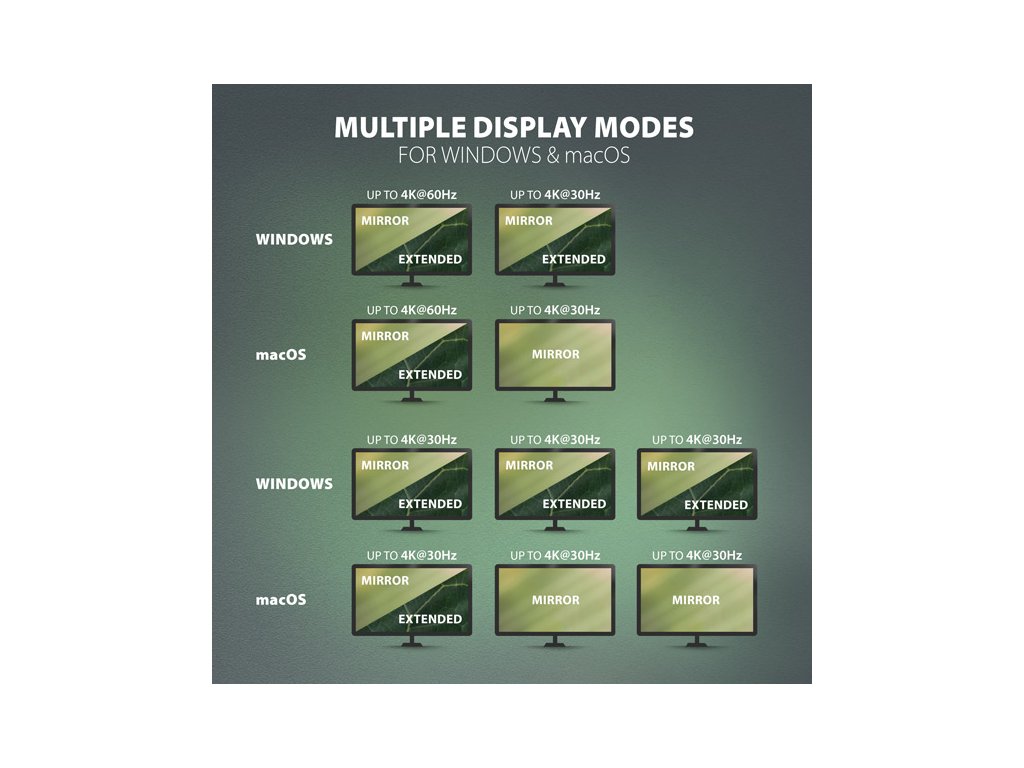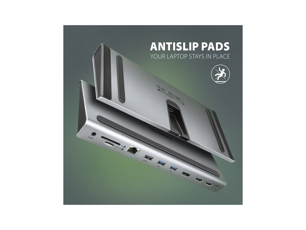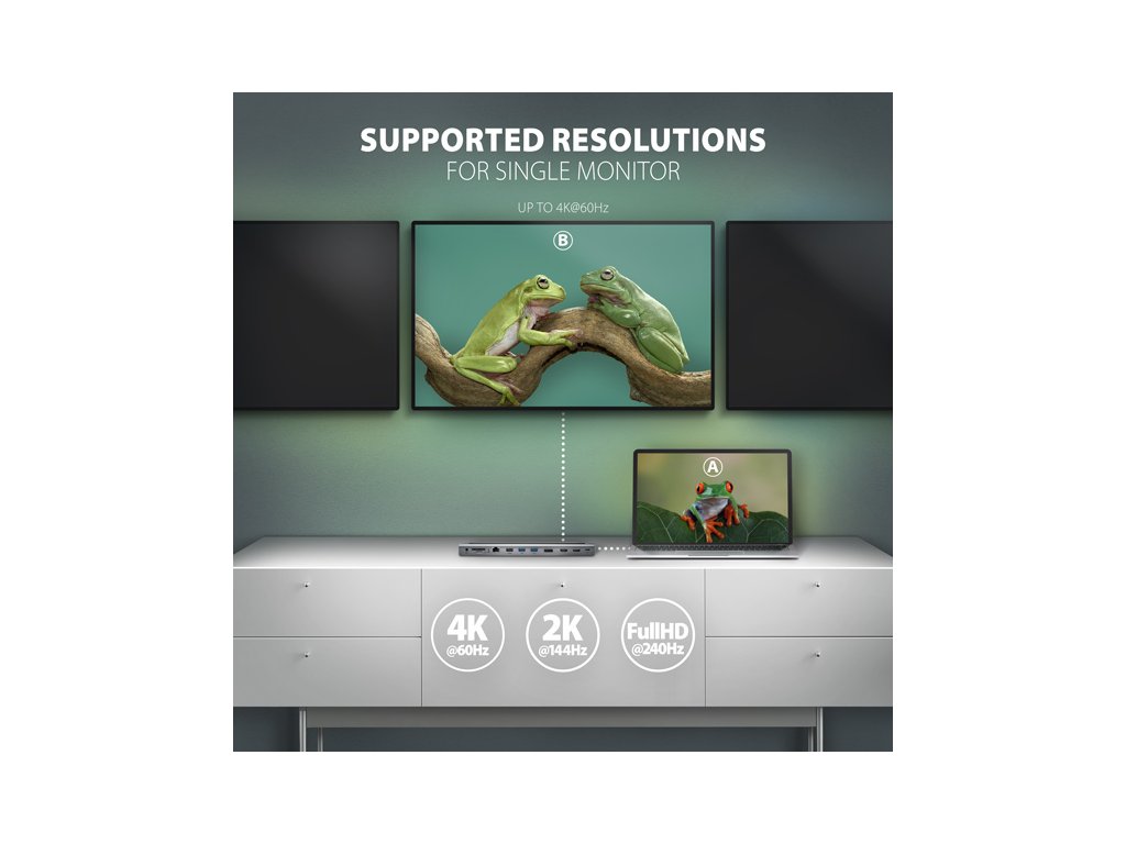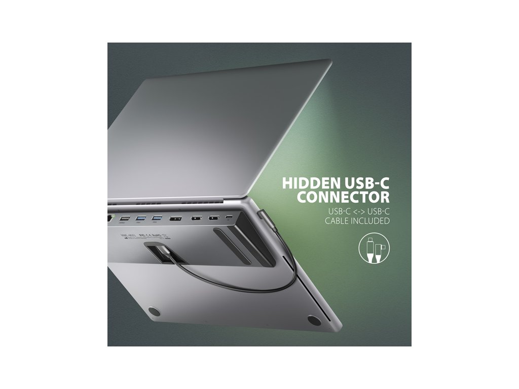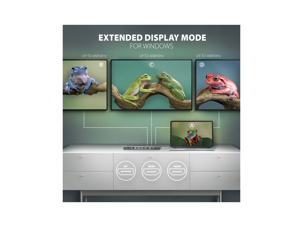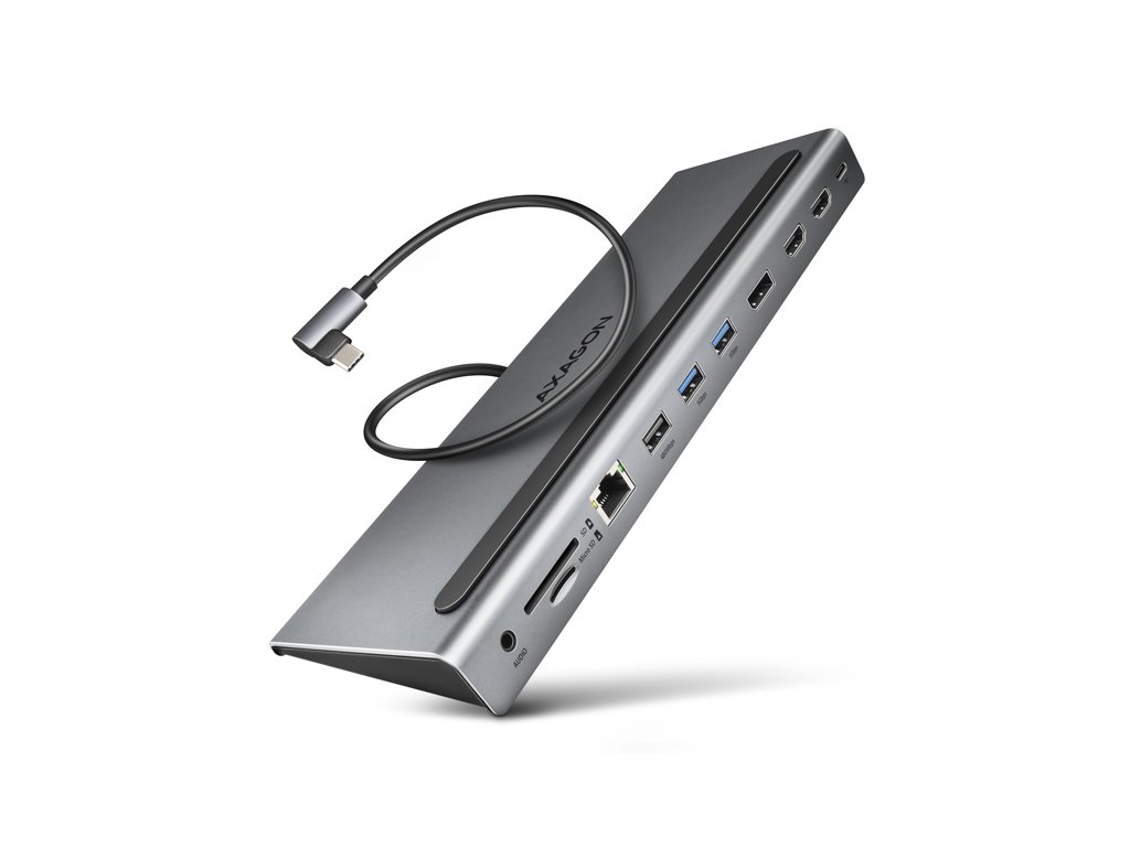 Multiportový USB-C 5Gbps TRIPLE 4K DISPLAY hub AXAGON HMC-4KX3 rozšíří Váš notebook o devět portů a čtečku paměťových karet SD / microSD. Přes oboustranný USB-C konektor snadno a rychle připojíte k počítači až tři monitory, tři USB zařízení, Gigabitovou ethernet síť, sluchátka a čtečku karet současně. Zároveň získáte možnost napájení notebooku pomocí technologie Power Delivery. USB-C hub tak zastane funkci univerzální a výkonné dokovací stanice 11v1 pro moderní notebooky. USB rozbočovač nabízí tři USB výstupy se standardními USB-A konektory. Hub zvládne trvalé připojení několika externích disků současně. Díky rychlému USB 3.2 Gen 1 rozhraní je přenosová rychlost hubu až 5Gb/s. Hub dále umožní nabíjení telefonů a tabletů proudem až 1.5A/5V, z hubu tak snadno nabijete např. Android smartphone, Apple iPhone, Apple iPad apod. USB-C konektor je vyhrazen pouze pro napájení a současné dobíjení notebooků pomocí technologie Power Delivery 3.0 výkonem až 100W. Do hubu zapojíte USB-C Power Delivery nabíječku a hub připojíte k notebooku. Tím také uvolníte jeden USB-C port. Podmínkou je notebook s podporou nabíjení z USB-C portu pomocí Power Delivery a vhodná PD nabíječka. Každý ze tří video výstupů (2x HDMI + 1x DisplayPort) poskytuje kvalitní obraz až do rozlišení 4K/60Hz Ultra HD. Podporovány jsou také vysoké frekvence v oblíbených hráčských rozlišeních 2K/144Hz nebo FullHD/240Hz. I při připojení tří monitorů současně zvládne dokovací stanice zajistit rozlišení až 4K/30Hz na každém z nich. Díky podpoře HDR (vysoce dynamický rozsah) si můžete bez omezení vychutnat výrazně rozšířený rozsah barev a kontrastů. Pro správné fungování video výstupu je nutné, aby USB-C port notebooku podporoval DisplayPort Alternate Mode (DP Alt Mode) nebo Thunderbolt 3/4. Podpora výše uvedených max. podporovaných rozlišení a frekvencí vyžaduje připojení k počítači s DisplayPort verze 1.4. Gigabitová síťová karta rozšíří počítač o rychlé a stabilní síťové připojení, doplní chybějící síťový RJ-45 Ethernet konektor, nebo přidá další síťovou kartu. Čtečka karet podporuje všechny verze SD a microSD karet včetně SDXC a microSDXC s kapacitou až 2TB. Vysoké přenosové rychlosti jsou zajištěny USB 3.2 Gen 1 rozhraním. Card reader umožňuje současnou práci s kartami v obou slotech a přímé kopírování mezi nimi. Robustní hliníkové tělo zajistí mechanickou odolnost i kvalitní chlazení dokovací stanice. Klínový tvar hubu vybízí k jeho použití jako podložky notebooku pro jeho lepší chlazení a ergonomickou polohu. Také přibalený USB-C kabel je navržen pro použití hubu jako podložky notebooku, optimální délka 40 cm spolu se zahnutým konektorem jej umožňuje téměř celý skrýt pod notebookem a přispět tak k dojmu čistého stolu. USB-C kabel je odpojitelný a lze jej tak v případě potřeby nahradit delším kabelem. Díky funkcím Plug and Play a Hot Plug je samotné zapojení hubu velmi jednoduché bez složité instalace a také lze jednoduše připojovat a odpojovat periferie za běhu počítače. Vstup: • USB 5Gbps (USB 3.2 Gen 1 / USB 3.0). • Kompatibilní s Thunderbolt 3/4. • Připojení přes reverzibilní USB type C female konektor. Výstupy USB: • 2x USB 5Gbps port, konektory USB-A female. • 1x USB 480Mbps port, konektor USB-A female. • 1x Power Delivery port (jen napájení), konektor USB-C female. • USB-C hub zvládne připojení několika externích disků současně. • Nabíjení mobilních zařízení (včetně iPad) proudem až 1.5A z USB-A portů hubu. Výstupy video: • 2x HDMI port, konektory HDMI A female. • 1x DP port, konektor DisplayPort female. Rozlišení video: 1 připojený monitor v kterémkoliv z video portů: • 4K rozlišení 4096 x 2160 při až 60Hz.* • 2K / WQHD rozlišení 2560 x 1440 při až 144Hz (Mac přes DP až 165Hz). * • FHD rozlišení 1920 x 1080 při až 240Hz (Mac max. 144Hz). * 2 současně připojené monitory - až 4K/60Hz na jednom monitoru a 4K/30Hz na druhém monitoru. * 3 současně připojené monitory - až 4K/30Hz na všech monitorech. * * Platí pro připojení k počítači s DisplayPort verze 1.4. • Pro funkci video výstupu je nutné hub zapojit do USB-C portu s podporou DisplayPort Alternate Mode (DP Alt Mode) nebo do USB-C portu s podporou Thunderbolt 3. Dále je nutný vhodný OS. Bez této podpory nebude funkce video výstupu dostupná. • Podpora HDR (High dynamic range, 10 bit support) - realistická reprodukce světlých a tmavých detailů. • Podpora HPD (Hot-Plug-Detect). • Podpora TMDS (Transition Minimized Differential Signaling). • Plná podpora HDCP 1.4 a 2.3 (High-bandwidth Digital Content Protection). • Podpora 2kanálového zvuku vzorkovací frekvence až 48 kHz a až 24bitového zvuku – závisí na zdrojovém a koncovém zařízení, tj. notebooku/telefonu a TV/monitoru/AV receiveru. Podpora zobrazovaných módů ve Windows: • zrcadlení anebo rozšíření plochy primárního monitoru na každém z až tří připojených monitorů, • každý z připojených monitorů může zobrazovat buď zrcadlenou nebo rozšířenou plochu primárního monitoru podle potřeby, např. na jednom monitoru bude zobrazena zrcadlená plocha primárního monitoru a na dalších dvou monitorech budou zobrazeny dvě různé rozšířené plochy. Podpora zobrazovaných módů v MacOS: • zrcadlení plochy primárního monitoru na všech až třech připojených monitorech, • rozšíření plochy primárního monitoru na jednom z připojených monitorů + zrcadlení plochy primárního monitoru na dalších až dvou připojených monitorech, • rozšíření plochy primárního monitoru na jednom z připojených monitorů + zrcadlení rozšířené plochy prvního monitoru na dalších 