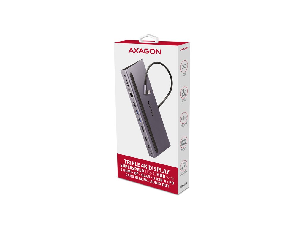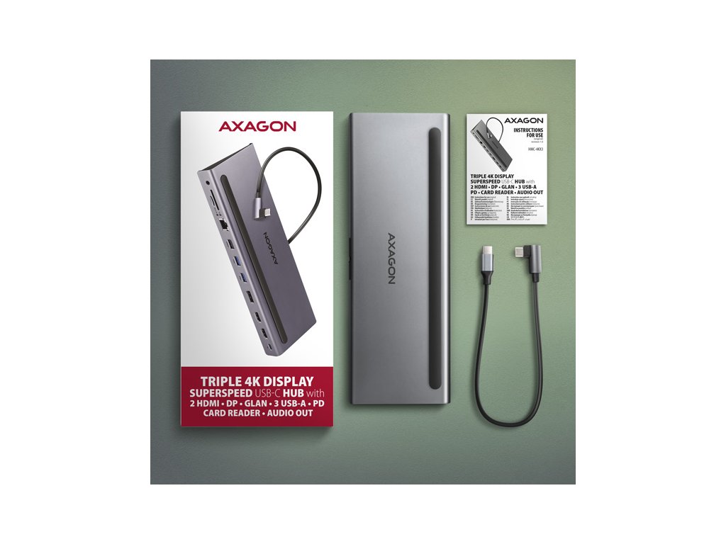 AXAGON HMC-4KX3 USB 5Gbps hub, 3x USB-A, 2x HDMI, DP, RJ-45, SD/microSD, audio, PD 100W, kábel 40cm HMC-4KX3