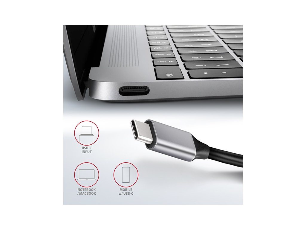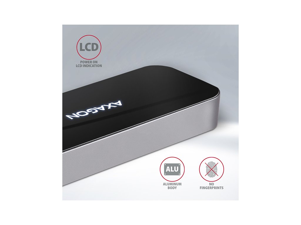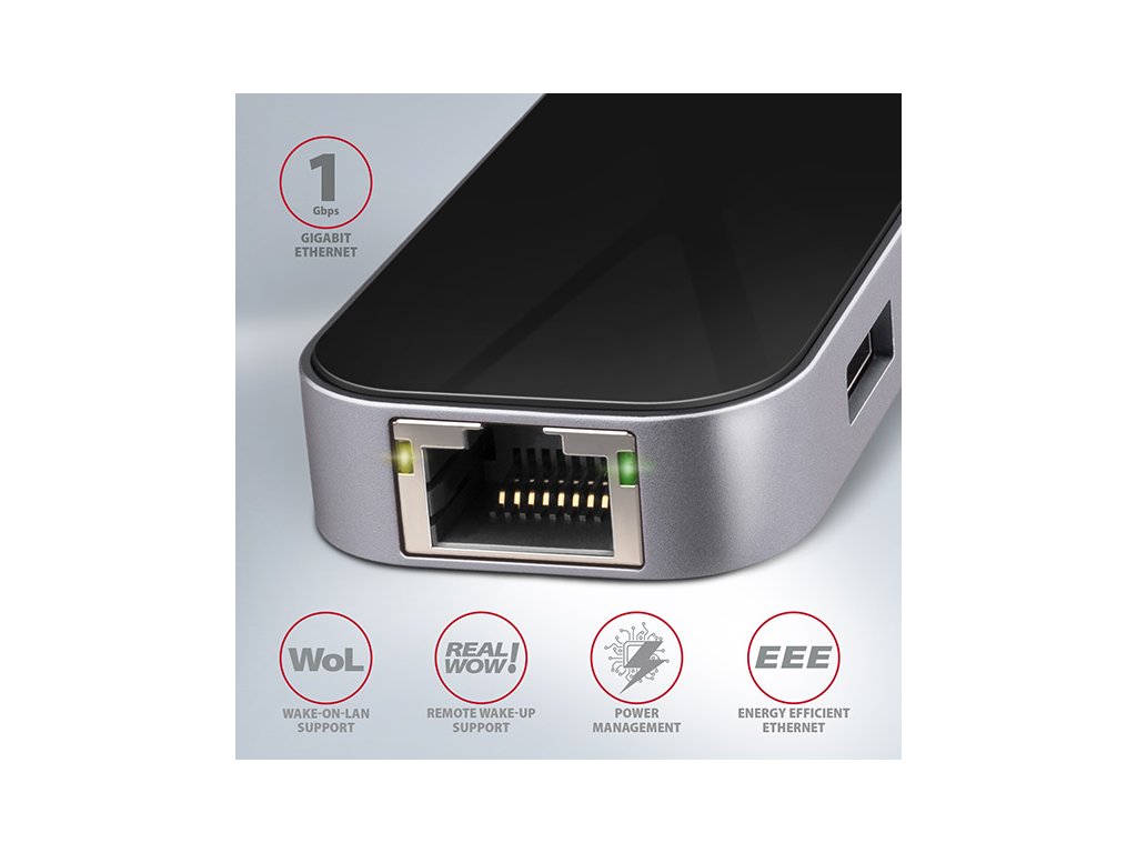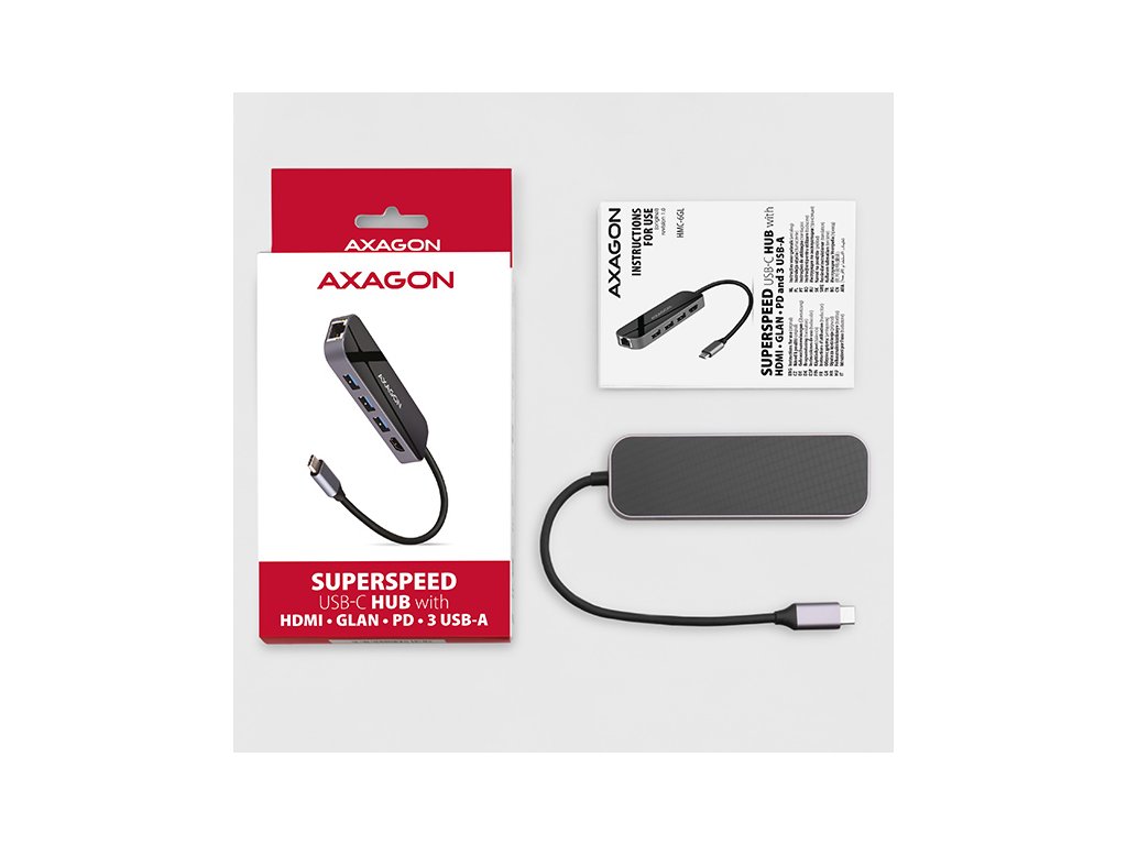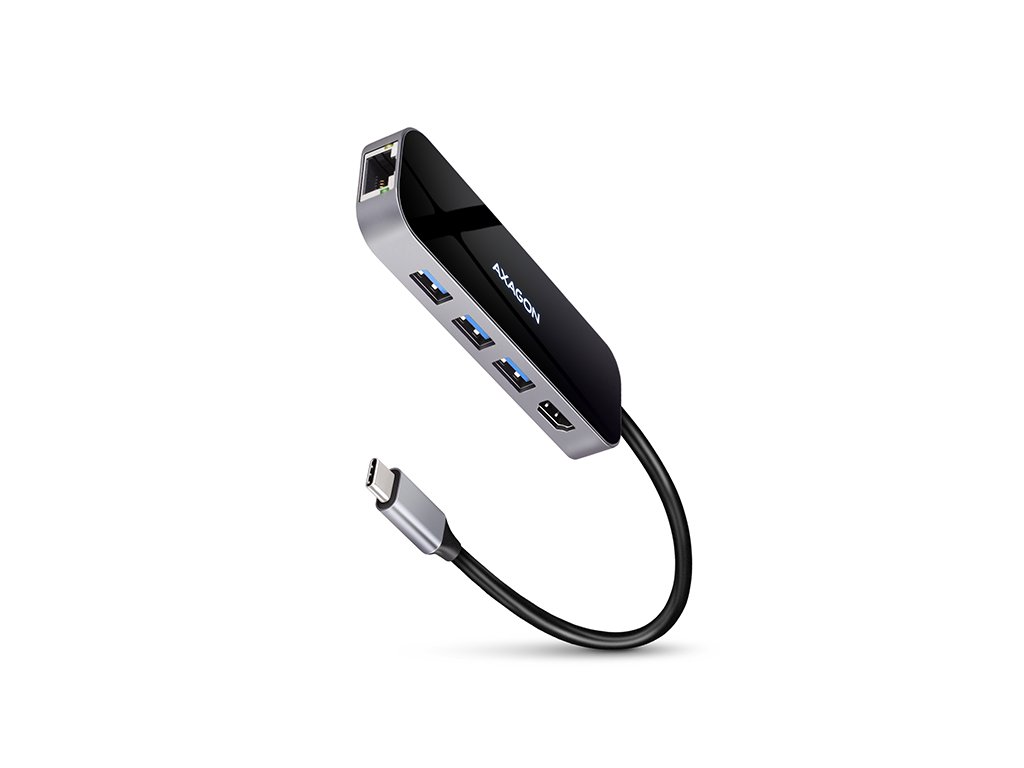 Multiportový USB-C 3.2 Gen 1 hub AXAGON HMC-6GL rozšíří Váš notebook, počítač nebo telefon o šest portů. Přes oboustranný USB-C konektor snadno a rychle připojíte k počítači až tři USB zařízení, Gigabitovou ethernet síť a HDMI zobrazovač současně. Zároveň získáte možnost napájení notebooku pomocí technologie Power Delivery. USB-C hub vám tak poskytne jednoduchou a skladnou dokovací stanici 6v1 k notebooku jako je například MacBook Pro. USB rozbočovač nabízí tři USB výstupy se standardními USB-A konektory. Hub zvládne trvalé připojení několika externích disků současně. Díky rychlému USB 3.2 Gen 1 rozhraní je přenosová rychlost hubu až 5Gb/s. Hub dále umožní nabíjení telefonů a tabletů proudem až 1,5A/5V, z hubu tak snadno nabijete např. Android smartphone, Apple iPhone, Apple iPad apod. USB-C konektor je vyhrazen pouze pro napájení a současné dobíjení telefonů nebo notebooků pomocí technologie Power Delivery 3.0 výkonem až 100W. Do hubu zapojíte USB-C Power Delivery nabíječku a hub připojíte k notebooku. Tím také uvolníte jeden USB-C port. Podmínkou je notebook s podporou nabíjení z USB-C portu pomocí Power Delivery a vhodná PD nabíječka. HDMI výstup poskytuje kvalitní obraz až do rozlišení 4K/30Hz Ultra HD a podporuje přenos vícekanálového zvuku. Podporována jsou také oblíbená hráčská rozlišení WQHD 2560 x 1440 při 60Hz nebo FullHD 1920 x 1080 při 60, 100 a 120Hz max. Pro správné fungování video výstupu je nutné, aby USB-C port notebooku podporoval DisplayPort Alternate Mode (DP Alt Mode) nebo Thunderbolt 3. Gigabitová síťová karta rozšíří počítač o rychlé a stabilní síťové připojení, doplní chybějící síťový RJ-45 Ethernet konektor, nebo přidá další síťovou kartu. LAN adapter je kompatibilní s rychlostmi 10/100/1000 Mbit/s a nabízí také širokou škálu funkcí např. IPv4/IPv6, crossover detekci a autokorekci, Wake-on-LAN, práce s VLAN nebo pokročilé funkce Power Managementu. Elegantní hliníkové tělo zajistí nejen mechanickou odolnost, ale i kvalitní chlazení. Horní lesklá část s decentně podsvíceným logem podtrhuje prémiový vzhled hubu. Replikátor portů je ideálním doplňkem pro notebooky bez USB-A konektorů, síťové karty a video výstupu. V hubu lze využít Vaše stávající USB periferie bez nutnosti pořizování nových. Díky funkcím Plug and Play a Hot Plug je samotné zapojení hubu velmi jednoduché bez složité instalace a také lze jednoduše připojovat a odpojovat periferie za běhu počítače. Rozbočovač se nezalekne ani připojení k telefonům s USB-C konektorem. K telefonu tak připojíte například flash disk, klávesnici, myš, monitor, TV nebo projektor. Vstup: • 1x USB 3.2 Gen 1 / SuperSpeed USB port, konektor USB-C male. • Zpětně kompatibilní s USB 3.1 Gen 1 / USB 3.0 a USB 2.0. • Kompatibilní s Thunderbolt 3. • Připojovací USB konektor typu C male (samec) umístěn na napevno uchyceném 20 cm kabelu. Výstupy USB: • 3x SuperSpeed USB port, konektor USB-A female. • 1x USB type C Power Delivery port (jen nabíjení), konektor USB-C female. • Podpora přenosových rychlostí 5.000 / 480 / 12 / 1.5 Mb/s (SuperSpeed / High / Full / Low speed). • Celková propustnost / přenosová rychlost je dána použitým USB 3.2 Gen 1 rozhraním (teoreticky až 5 Gbit/s). • USB-C hub zvládne připojení několika externích disků současně. • Nabíjení mobilních zařízení (včetně iPad) proudem až 1.5A v každém z USB portů hubu. Celkový nabíjecí proud (který se dělí na porty) dosahuje až 2.1A při napětí 5V (záleží na možnostech USB portu počítače). Výstup HDMI: • HDMI. • Konektor HDMI A (F) female. • Maximální podporované rozlišení 4K / 4096 x 2160 při 30 Hz. • WQHD rozlišení 2560 x 1440 při 60 Hz max. • FullHD rozlišení 1920 x 1080 při 60, 100, 120 Hz max. • Pro funkci video výstupu je nutné hub zapojit do USB-C portu s podporou DisplayPort Alternate Mode (DP Alt Mode) nebo do USB-C portu s podporou Thunderbolt 3. Zároveň je nutná podpora ze strany zařízení (notebooku, telefonu) a operačního systému. Bez této podpory nebude funkce video výstupu dostupná. • Podpora HPD (Hot-Plug-Detect). • Podpora TMDS (Transition Minimized Differential Signaling). • Plná podpora HDCP 1.4 a 2.3 (High-bandwidth Digital Content Protection). • Podpora až 8kanálového LPCM zvuku, komprimovaného audia (AC-3, DTS) a HBR audio formátů. • Podpora vzorkovací frekvence až 192 kHz a až 24bitového zvuku – závisí na zdrojovém a koncovém zařízení, tj. notebooku/telefonu a TV/monitoru/AV receiveru. Výstup RJ-45: • Rozhraní Gigabit Ethernet s RJ-45 konektorem pro připojení UTP nebo STP kabelem. • Podporované přenosové rychlosti Ethernet rozhraní 10/100/1000 Mb/s. • Podporované specifikace IEEE 802.3 10Base-T, IEEE 802.3u 100Base-TX, IEEE 802.3ab 1000Base-T. • 10/100/1000 Mb/s autodetekce. • Podpora IPv4/IPv6 packet Checksum Offload Engine (COE) pro snížení zatížení procesoru včetně IPv4 IP/TCP/UDP/ICMP/IGMP & IPv6 TCP/UDP/ICMPv6 kontroly a generování kontrolního součtu. • Podpora TCP Large Send Offload V1 a V2. • Podpora IEEE 802.1P Layer 2 priority encoding & decoding. • Podpora IEEE 802.1Q VLAN tagging. • Podpora IEEE 802.3az EEE (Energy Efficient Ethernet) - snížení spotřeby v klidovém stavu. • Podpora Jumbo frame. • Podpora full-duplex přenosů s IEEE 802.3x flow control i half-duplex přenosů s back-pressure flow control. • Podpora Auto MDI/MDIX - crossover detekce a autokorekce eliminuje potřebu crossover kabelů. • Podpora hardwarového Cyclic Redundancy Check (CRC) pro odhalení chyb přenosu. • Podpora pair swap/polarity/skew korekce. • Funkce Wake-on-LAN v různých módech: Podpora režimu spánku a vzdáleného probuzení pomocí Mag