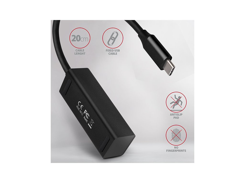 Miniaturní kovový USB-C 3.2 Gen 1 hub AXAGON HUE-M1C snadno a rychle připojí k notebooku nebo počítači až čtyři USB zařízení současně. Kovové tělo hubu je vyrobeno z hliníku a zajišťuje tak dokonalou mechanickou ochranu pro časté přenášení. Elegantní, jemně strukturovaný povrch brání nežádoucím otiskům. Gumové nožky zabraňují klouzání hubu po stole. Napevno uchycený USB kabel délky 20 cm je ideální pro uživatele mobilních zařízení. Tento malý cestovní hub také zvládne trvalé připojení několika externích disků. Díky rychlému USB 3.2 Gen 1 rozhraní je přenosová rychlost až 5Gb/s. Hub dále umožní nabíjení telefonů a tabletů proudem až 1,5A/5V, z hubu tak snadno nabijete např. Android smartphone, Apple iPhone, Apple iPad apod. USB hub je ideálním doplňkem pro ultrabooky s malým počtem USB-A portů. Rozbočovač se nezalekne ani připojení k telefonům s USB-C konektorem. K telefonu nebo tabletu tak připojíte například flash disk, klávesnici a myš. Vstup: • 1x USB 3.2 Gen 1 / SuperSpeed USB port, konektor USB-C male. • Zpětně kompatibilní s USB 3.1 Gen 1 / USB 3.0 / USB 2.0 a USB 1.1. • Kompatibilní s Thunderbolt 3 rozhraním. • Připojovací USB konektor typu C male (samec) umístěn na napevno uchyceném 20 cm kabelu. Výstupy: • 4x SuperSpeed USB port, konektory USB-A female. • Podpora přenosových rychlostí 5.000 / 480 / 12 / 1.5 Mb/s (SuperSpeed / High / Full / Low speed). • Celková propustnost / přenosová rychlost je dána použitým USB 3.2 Gen 1 rozhraním (teoreticky 5 Gbit/s). • USB hub zvládne připojení několika externích disků současně. Vlastnosti: • Možnost připojení zařízení za chodu díky podpoře Hot Plug. • Plná podpora Plug and Play. • Podpora úsporného režimu. • Kvalitní stíněný kabel zaručuje vysokou rychlost komunikace a minimální nežádoucí interference. • Bílá LED indikuje připojení hubu k počítači. • Napájení po USB sběrnici (USB bus power). • Rozměry 70 x 24 x 18 mm. • Hmotnost 33 g (vč. kabelu). • Délka USB kabelu 20 cm. Napájení/Nabíjení: • Napájení po USB sběrnici je dostatečné pro připojení USB zařízení s nízkým odběrem (myš, klávesnice, čtečka karet, flash disk apod.) nebo vlastním napájením (tiskárna, skener, 3.5'' externí disk) do všech čtyř portů. • USB hub také zvládne trvalé připojení několika externích disků současně. • Nabíjení mobilních zařízení (včetně iPad) proudem až 1.5A v každém z portů hubu. Celkový nabíjecí proud (který se dělí na porty) dosahuje až 2,8A při napětí 5V (záleží na možnostech USB portu počítače). Podporované operační systémy: • MS Windows XP / Vista / 7 / 8 / 8.1 / 10 a novější, Windows Server 2003 / 2008 / 2012 / 2016 a novější (podporovány všechny 32- i 64-bitové verze OS Windows), Mac OS X 10.4.x a vyšší, Linux s jádrem 2.6.x a vyšším, Android většina verzí. Pozn.: Ovladače jsou součástí podporovaných operačních systémů a nainstalují se zcela automaticky. Žádné jiné ovladače není třeba instalovat a nejsou ani k dispozici. Balení v kartonové krabičce s otvorem pro zavěšení obsahuje: • SuperSpeed USB-C rozbočovač s kabelem napevno délky 20 cm, • multijazyčný manuál CZ/DE/DK/ENG/ESP/FIN/FR/GR/HR/HU/IT/NL/PL/PT/RO/RU/SK/SWE/BG/CN/TR/ARA.Buďte prvý, kto napíše príspevok k tejto položke.