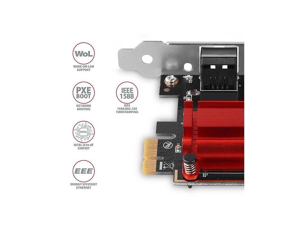 PCI-Express síťová karta AXAGON PCEE-GIX rozšíří stolní počítač o vysokorychlostní Gigabit Ethernet připojení. Zpětně kompatibilní s 10/100Base-T sítěmi. Karta je osazena výkonným čipem I210AT společnosti Intel, který nabízí mnoho rozšířených funkcí jako například precizní synchronizaci času, tvarování provozu pro AV streamy, funkce snižující zatížení procesoru a podporu široké škály řízení spotřeby. LAN adaptér podporuje bootování po síti (PXE) a zaručuje bezproblémovou kompatibilitu s většinou operačních systémů. Gigabitová síťovka rozšíří počítač o rychlé síťové připojení, doplní chybějící RJ-45 konektor, přidá další síťovou kartu nebo nahradí původní nefunkční síťové připojení. Balení obsahuje kromě adaptéru se záslepkou standardního rozměru také low profile záslepku umožňující montáž adaptéru do nízkoprofilových skříní. Vstup: • Rozhraní PCI-Express 2.1, kompatibilní s PCI-Express 1.0a / 1.1 / 2.0 / 3.0. • Počet linek 1-Lane (x1), kompatibilní s x1 / x4 / x8 / x16 PCIe sloty. • Propustnost 1-Lane PCI-Express 2.1 sběrnice 5 Gb/s. Výstup: • Rozhraní Gigabit Ethernet s RJ-45 konektorem pro připojení UTP nebo STP kabelem. • Podporované přenosové rychlosti Ethernet rozhraní 10/100/1000 Mb/s. • Podporované specifikace IEEE 802.3 10Base-T, IEEE 802.3u 100Base-TX, IEEE 802.3ab 1000Base-T. Další vlastnosti: • Plná podpora Plug and Play. • 10/100/1000 Mbit/s autodetekce. • Podpora TCP/UDP, IPv4 checksum, IPv6 IP/TCP a IP/UDP checksum offload (Rx/ Tx/Large- send) pro snížení zatížení procesoru. • Podpora full-duplex přenosů s IEEE 802.3x a IEEE 802.3z flow control. • Podpora IEEE 802.3az-2010 (EEE) Energy Efficient Ethernet - snížení spotřeby v klidovém stavu. • Podpora Receive-Side Scaling (RSS) pro Windows - až čtyři fronty na port. • Podpora Auto MDI/MDIX - crossover detekce a autokorekce eliminuje potřebu crossover kabelů. • Podpora hardwarové funkce ECC (Error Correction Code). • Podpora Jumbo frames (až do 9.5 kB). • Podpora IEEE 1588/802.1AS Timestamping - HW podpora precizní synchronizace času. • Podpora IEEE 802.1Qav - směrování a queuing časově citlivých toků. • Podpora IEEE 802.1BA (802.1 AVB) - vylepšuje synchronizaci, spolehlivost a latenci audiovizuálních přenosů po síti. • Nabízí širší možnosti správy ve firemním prostředí. • Podpora bootování ze sítě díky integrovanému PXE. • Podpora IEEE 802.1Q VLAN. • Dvě LED diody pro indikaci aktivity a připojení ke gigabit síti. • Použit čipset Intel I210-AT. Podpora funkce Wake-on-LAN v různých módech: • Podpora režimu spánku a vzdáleného probuzení přes Magic packet. • Podpora standardu ECMA-393 proxZzzy® for sleeping hosts pro správu síťového připojení spících hostů pomocí proxy serverů. Pokročilé funkce Power Managementu: Síťová karta podporuje pokročilou správu napájení redukující ztráty při klidovém stavu nebo lehkém provozu na síti. Dále podporuje pokročilou úsporu energie při odpojení Ethernet kabelu. • Podpora Advanced Configuration Power management Interface (ACPI). • Podpora Advanced Power Management (APM). • Podpora Active State Power Management (ASPM). • Podpora PCI MSI (Message Signaled Interrupt) a MSI-X. Podporované operační systémy: • MS Windows 7 / 8 / 8.1 / 10 / 11 a novější, Windows Server 2008 R2 / 2012 / 2012 R2 / 2016 / 2019 / 2022 a novější (podporovány všechny 32- i 64-bitové verze OS Windows), Linux kernel 2.6.30 a novější, FreeBSD 10.x/11.x/12.x. Balení v kartónové krabičce obsahuje: • PCI-Express Gigabit Ethernet karta se standardní záslepkou, • low profile záslepka, • multijazyčný manuál CZ/DE/DK/ENG/ESP/FIN/FR/GR/HR/HU/IT/NL/PL/PT/RO/RU/SK/SWE/TR/BG/CN/ARA.Dodatočné parametre