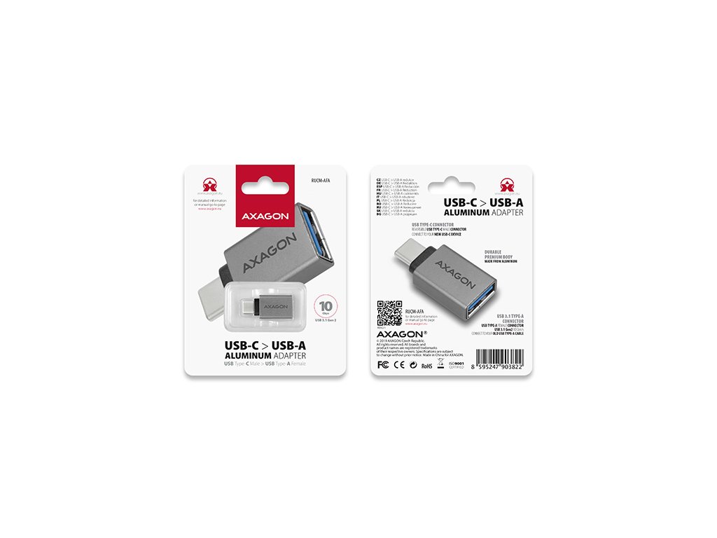 USB-C -> USB-A redukce AXAGON RUCM-AFA připojí stávající zařízení s USB Type A konektorem k novému zařízení s moderním USB Type C rozhraním. Kompaktní a odolná redukce umožní například rychlé připojení USB 3.0 hubu nebo externího disku k notebookům vybaveným pouze USB-C konektory. Výborně poslouží také pro připojení flash disku k mobilnímu telefonu s USB-C konektorem. USB-C -> USB-A adaptér lze použít nejen k přenosu dat, ale umožňuje také nabíjení až 3A. Hliníkové tělo, kvalitní konektory a podpora USB 3.1 Gen 2 až do rychlosti 10Gbit/s zajistí bezproblémovou funkčnost a dlouhodobé používání. Vstup: • Reverzibilní USB Type-C Male konektor. • Kompatibilní s USB 3.1 Gen 2, USB 3.1 Gen 1 / USB 3.0 a USB 2.0. • Podpora přenosových rychlostí 10.000 / 5.000 / 480 Mbit/s (SuperSpeed+ / SuperSpeed / High speed). Výstup: • USB Type-A Female konektor. • Kompatibilní s USB 3.1 Gen 2, USB 3.1 Gen 1 / USB 3.0 a USB 2.0. • Podpora přenosových rychlostí 10.000 / 5.000 / 480 Mbit/s (SuperSpeed+ / SuperSpeed / High speed). • Pro připojení stávajících zařízení a kabelů s USB Type-A výstupem. Další vlastnosti: • Hardwarová redukce bez čipů a elektroniky. • Pulldown rezistor 5 kOhm. • Odolné hliníkové tělo. • Rozměry 31 x 15 x 7.5 mm, hmotnost 4 g. Balení v zataveném blistru obsahuje: • USB-C -> USB-A redukci.Buďte prvý, kto napíše príspevok k tejto položke.