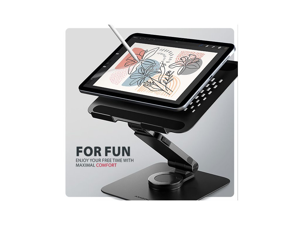 AXAGON STND-LRB je stojan s 360° rotací, dvojitým kloubem a výsuvným ramenem, který zajišťuje maximální pohodlí a výrazně zlepšuje ergonomii při práci s notebookem nebo tabletem. Je určený pro zařízení od 10'' do 17.3'', umožňuje nastavit ideální výšku a úhel pro uvolnění krčních a zádových svalů. Díky 360° mechanismu a výsuvnému ramenu se dokonale přizpůsobí vašim potřebám ať už pracujete doma, v kanceláři, nebo na cestách. Kompaktní a přenosný design stojanu vám zajistí komfortní pracovní prostředí kdekoliv. 360° mechanismus umožňuje otočení celého ramene s notebookem okolo své osy. Tato funkce zajišťuje maximální flexibilitu – snadno změníte orientaci notebooku, aniž byste museli stojan přemisťovat. To oceníte zejména při práci v omezených prostorech, nebo při sdílení obrazovky notebooku při obchodních jednáních, poradách nebo prezentacích. Unikátní funkcí je výsuvné rameno s pojistkou proti uvolnění, které umožňuje jeho prodloužení až o 6 cm díky sedmi nastavitelným pozicím. Tímto způsobem snadno nastavíte notebook do optimální výšky a vzdálenosti od vašich očí přesně podle vašich potřeb. Chytré řešení s dvojitým kloubem poskytuje plynulé nastavení výšky obrazovky tak, aby byla v jedné rovině s vaším externím monitorem. Tím získáte další pracovní plochu ve správné úrovni očí, což výrazně zlepšuje ergonomii, zvyšuje pohodlí a zároveň podporuje vaši produktivitu. Podstavec pro notebook je vyroben z robustních hliníkových odlitků garantujících dlouhou životnost a spolehlivost. Díky protiskluzové úpravě zůstane vaše zařízení bezpečně na svém místě bez rizika nechtěných pohybů, aniž by došlo k jakémukoliv poškození povrchu notebooku nebo podložky. Tyto pečlivě navržené vlastnosti zaručují perfektní stabilitu pro váš notebook, tablet nebo oblíbenou knihu, což vám poskytne klid a pohodlí při každodenním používání. Stojan lze snadno složit do kompaktních rozměrů, což umožňuje pohodlné přenášení kamkoli potřebujete. Jeho elegantní design v černé barvě stylově doplní váš pracovní stůl. Větrací otvory v podložce zajišťují optimální odvod tepla z vašeho notebooku, čímž zvyšují jeho výkon a životnost. Vlastnosti: • Lehká a pevná kovová konstrukce. • Protiskluzová úprava, která zároveň chrání zařízení od poškrábání. • Vhodný pro 10''–17.3'' notebooky nebo jiná zařízení. • Otočný mechanismus ramene (360° kolem své osy). • Nastavitelná výška až 260 mm. • Mnoho nastavitelných poloh. • Nastavení sklonu plochy pro notebook (0–180°). • Nastavení sklonu ramene (0–180°). • Nastavitelný výsuv ramene (0–60 mm, 7 pozic). • Nosnost dimenzována pro všechny typy notebooků, max. 5 kg. • Skladný a lehce složitelný. • Držák notebooku umožňuje lepší odvod tepla. • Rozměry: 260 × 232 × 58 mm (Š × H × V). • Hmotnost: 1095 g. Balení v kartonové krabičce obsahuje: • Stojan na notebook/tablet, • černá verze provedení.Dodatočné parametre