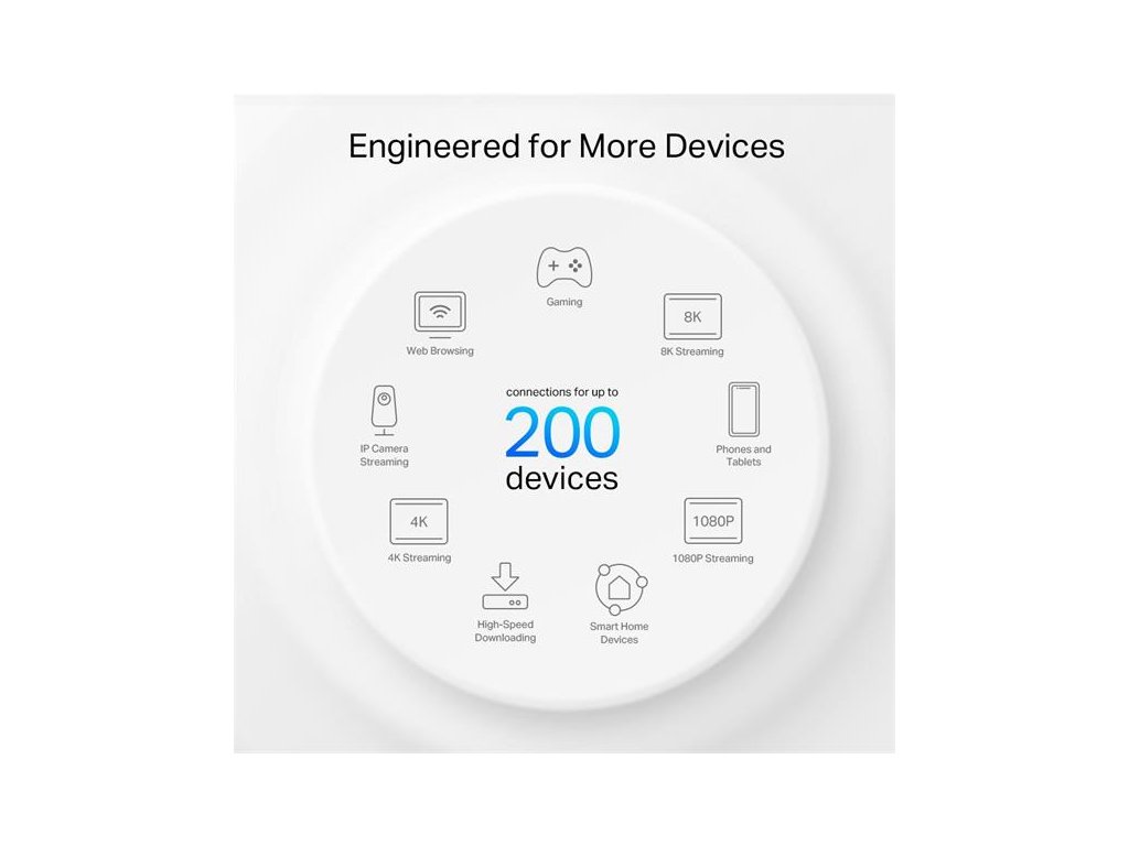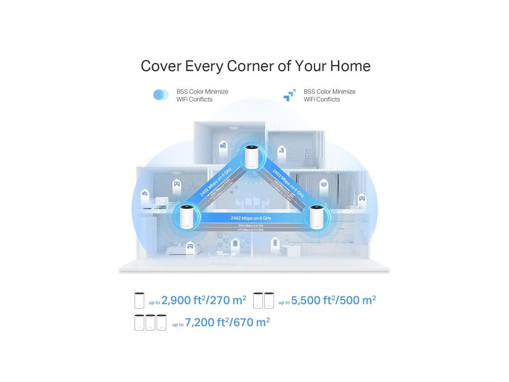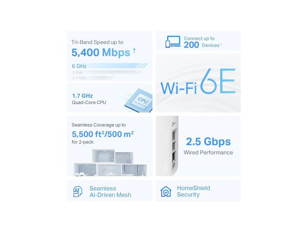 Wi-Fi 6E pokrytie celej domácnosti – pokryte plochu až 500 m2 ničím nerušeným Wi-Fi signálom budúcej generácie a zabudnite na mŕtve zóny pokrytia a načítania do vyrovnávacej pamäte†, ‡