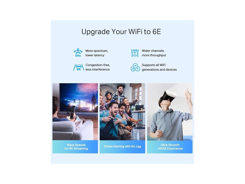 Úplne nové pásmo 6 GHz – začnite využívať najnovšiu frekvenciu Wi-Fi a zbavte sa rušenia, ktorých pôvodom sú všetky staršie zariadenia. 6GHz pásmo taktiež poskytuje výkonné vyhradené chrbticové pripojenie pre ďalšie zlepšenie výkonu Wi-Fi pripojenia pri zariadení bez podpory štandardu Wi-Fi 6E?