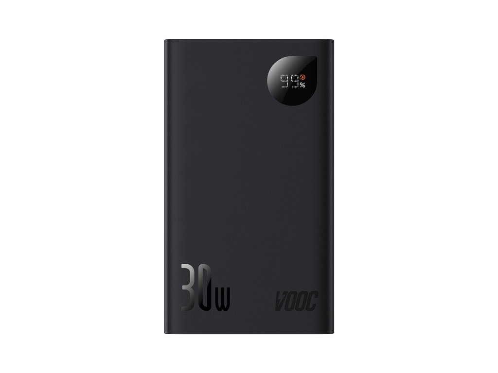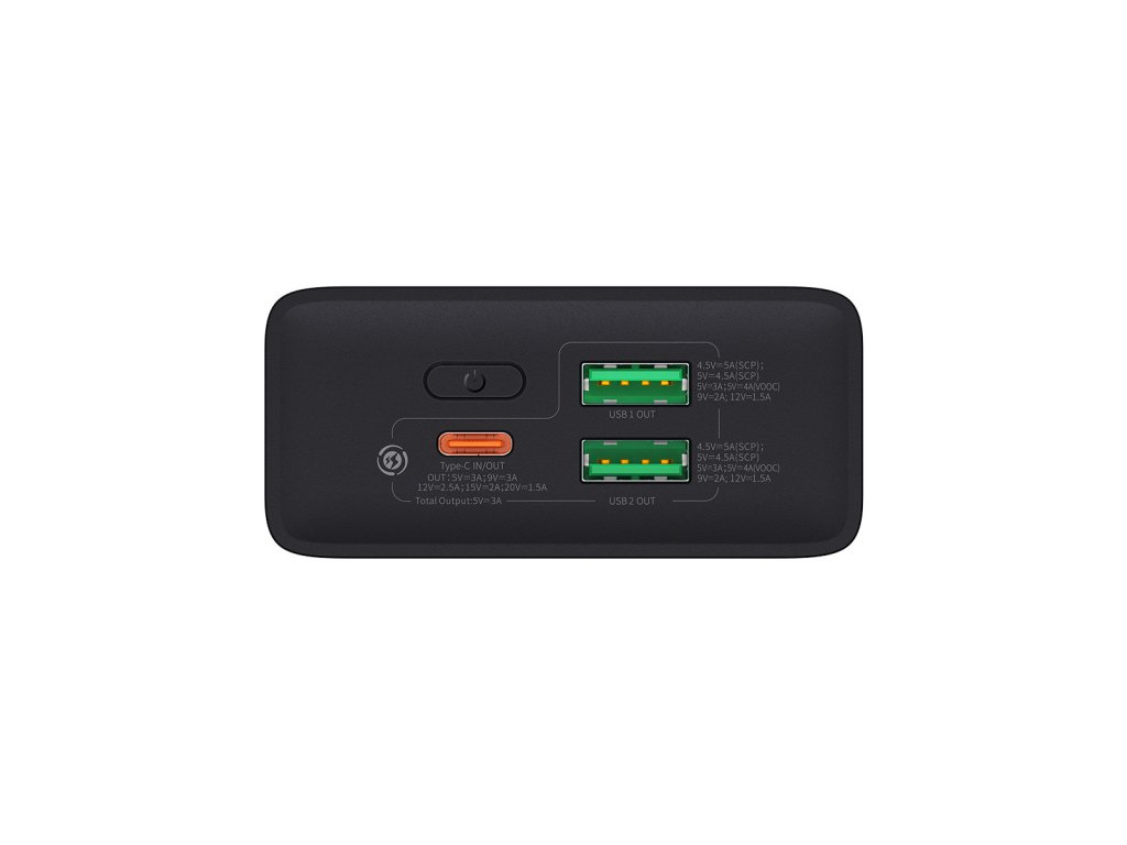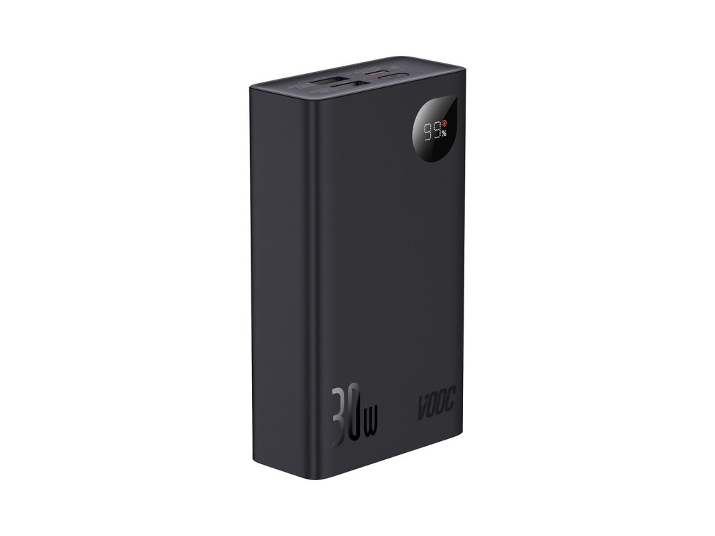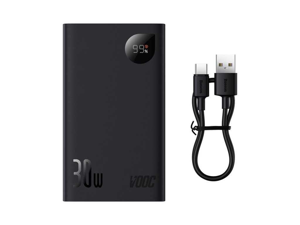 Baseus Adaman2 powerbanka s digitálním displejem 20000mAh 30W Vlastnosti * výstupní výkon 30W * současné nabíjení až 3 zařízení * LED displej indikuje úroveň nabití baterie * rychlé nabíjení: PD (Power Delivery), SCP (Huawei Super Charge Protocol), FCP (Huawei Fast Charge Protocol), QC (Qualcomm Quick Charge), AFC (Samsung Adaptive Fast Charging) Technické parametry Typ baterie: lithium-polymer Kapacita baterie: 20000mAh/76Wh Celkový výstupní proud: 5V/3A Barva: černá Rozměry: 118x68,5x31mm Hmotnost: 360g Porty: * 2x USB-A: 4,5V/5A (SCP), 5V/4,5A (SCP), 5V/3A, 5V/4A (VOOC), 9V/2A, 12V/1,5A (výstup) * 1x USB-C: 5V/3A, 9V/3A, 12V/2,5A, 15V/2A, 20V/1,5A (vstup/výstup) Záruka: 2 rokyDodatočné parametre
