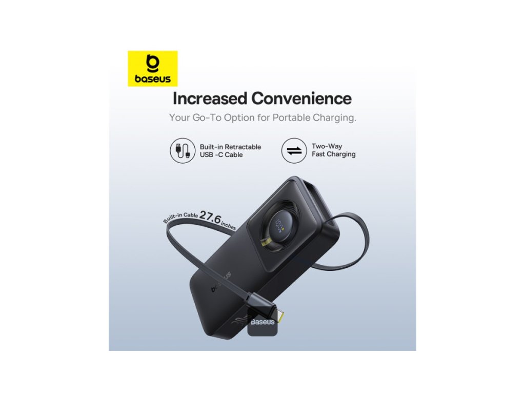Powerbanka Baseus Free2Pull 10000mAh s vestavěným zatahovacím kabelem typu C pro notebook – 30W rychlé nabíjení, digitální displej – černá Představujeme Baseus Free2Pull Power Bank se zatahovacím nabíjecím kabelem - šikovná powerbanka s velkou kapacitou 10000mAh, která vám pomůže rychle a spolehlivě nabíjet mobilní zařízení, jako jsou telefony, tablety, bezdrátová sluchátka a další. Výrobek je dodáván se zatahovacím/samoprodlužovacím nabíjecím kabelem, který vám pomáhá šetřit místo a snadno se používá v jakékoli situaci. S výkonem až 30 W vám Baseus Free2Pull Power Bank umožňuje rychle nabíjet vaše zařízení, šetří čas čekání a udržuje vás ve spojení. *30W rychlé nabíjení pro notebooky, telefony a tablety *Vestavěný zatahovací kabel typu C pro pohodlí a organizaci *Kapacita 10 000 mAh nabíjí zařízení několikrát *Digitální LED displej pro snadné sledování stavu baterie *Kompaktní design ideální pro cestování nebo každodenní použití *Nabíjení více zařízení: Nabíjejte současně notebooky, telefony, tablety a další *Safety First s komplexní ochranou proti přebití a zkratůmDodatočné parametre
