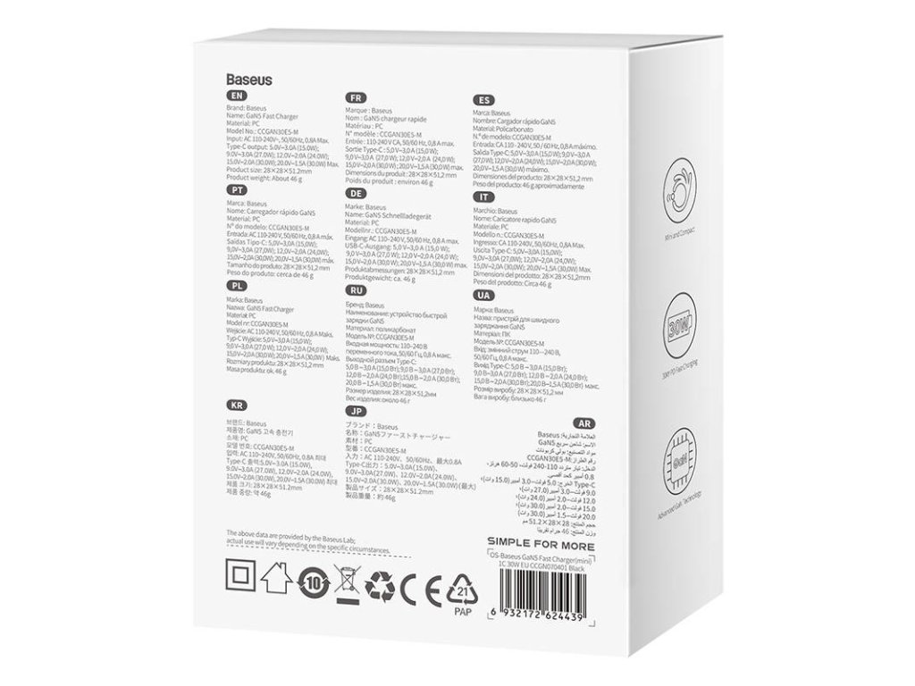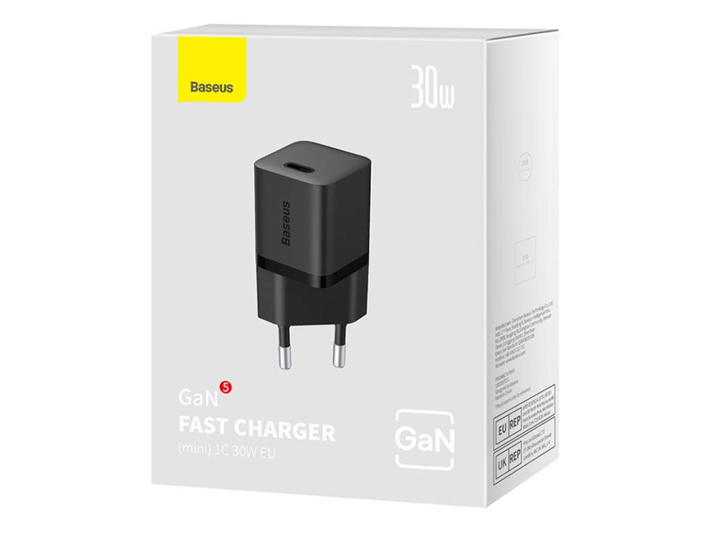 Baseus GaN5 30W mini síťová rychlonabíječka Vlastnosti * výstupní výkon 30W * technologie regulace teploty BCT * ochrana proti přepětí Technické parametry Výstup USB-C: 5V/3A, 9V/3A, 12V/2A, 15V/2A, 20V/1,5A Vstupní proud: AC 100-240V ~50/60Hz 0,8A Max. Barva: černá Rozměry: 34×28mm Hmotnost: 41g Záruka: 2 rokyDodatočné parametre