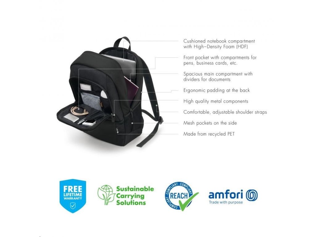 Tento kompaktný batoh ponúka ideálnu ochranu pre notebooky s veľkosťou 15 až 17.3" vďaka výplni z peny s vysokou hustotou (HDF). Jeho ľahká konštrukcia zaručuje flexibilnú mobilitu. Priestranná hlavná časť je rozdelená tak, aby sa dokumenty a príslušenstvo dali uložiť oddelene. Predné vrecko má praktické menšie priehradky, do ktorých si môžete usporiadať menšie predmety, ako je smartfón, perá alebo nabíjačky. V ľahko prístupných bočných sieťovaných vreckách je miesto na fľašu na vodu alebo dáždnik. Môžete si tak byť istí, že všetko, čo potrebujete, máte vždy po ruke. Vďaka ergonomickému polstrovaniu sa batoh pohodlne nosí na chrbte a ramenné popruhy sa dajú nastaviť pre väčšie pohodlie. Ekologický batoh BASE je preto pre vás ideálny, ak ste stále na cestách a chcete podporiť recykláciu PET fliaš ekologickou taškou.