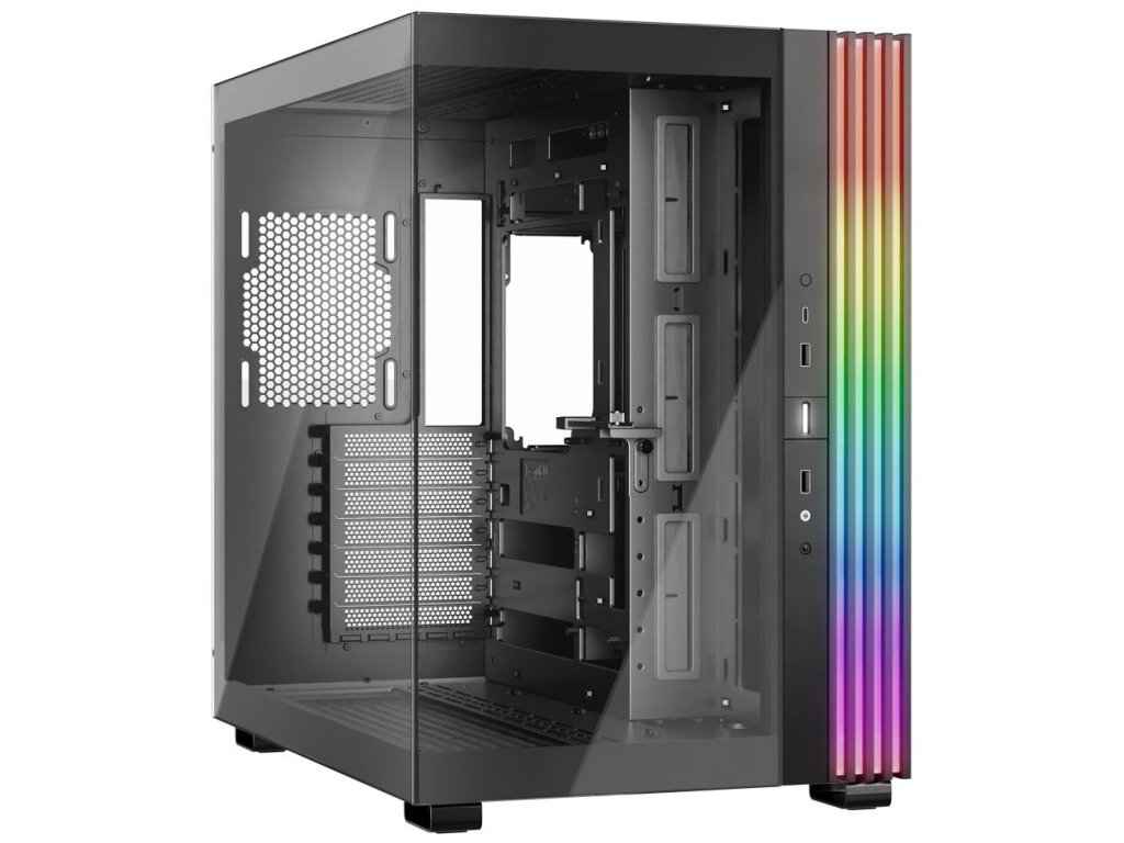 Unikátní počítačová skříň s průhlednou bočnicí i předním panelem formátu Middle Tower nabízí dostatek prostoru pro montáž většiny dostupných komponent. Hlavní předností této skříně je možnost rychlé změny její orientace díky systému odnímatelných a přemístitelných nožiček. Skříň je dodávána bez předinstalovaných ventilátorů, nabízí ale až 10 pozic pro ventilátory a dva integrované rozbočovače ventilátorů a ARGB. Na předním panelu se nachází dva porty USB 3.0, jeden port USB-C, sluchátkový výstup a audio vstup pro mikrofon. Herní design ještě doplňuje elegantní ARGB osvětlení lemující strany skříně, díky čemuž je viditelné bez ohledu na to, v jaké orientaci skříň používáte. Ve skříni je dostatek prostoru pro chladič CPU do výšky až 170 mm a grafickou kartu o délce až 400 mm. Důmyslné řešení umožňuje pohodlné umístění až 360 mm dlouhého výměníku vodního chlazení na horní nebo spodní straně. Potěší také přítomnost prachových filtrů či integrovaná podpěra grafické karty. Skříň je dodávána bez zdroje.