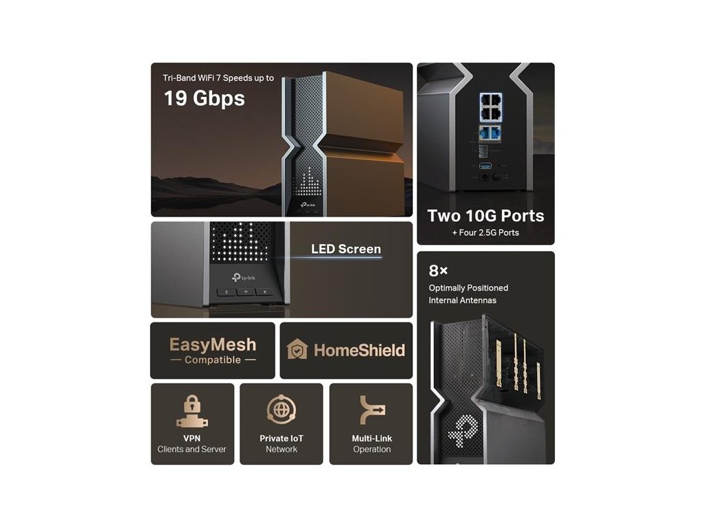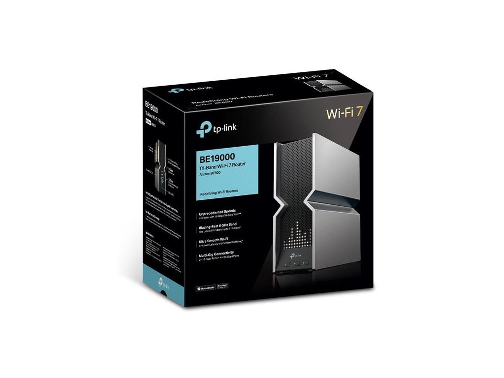 BE19000 Tri Band Wi-Fi 7 Router SPEED: 1376 Mbps at 2.4 GHz + 5760 Mbps at 5 GHz + 11520 Mbps at 6 GHz SPEC: 8× Internal Archer BE800