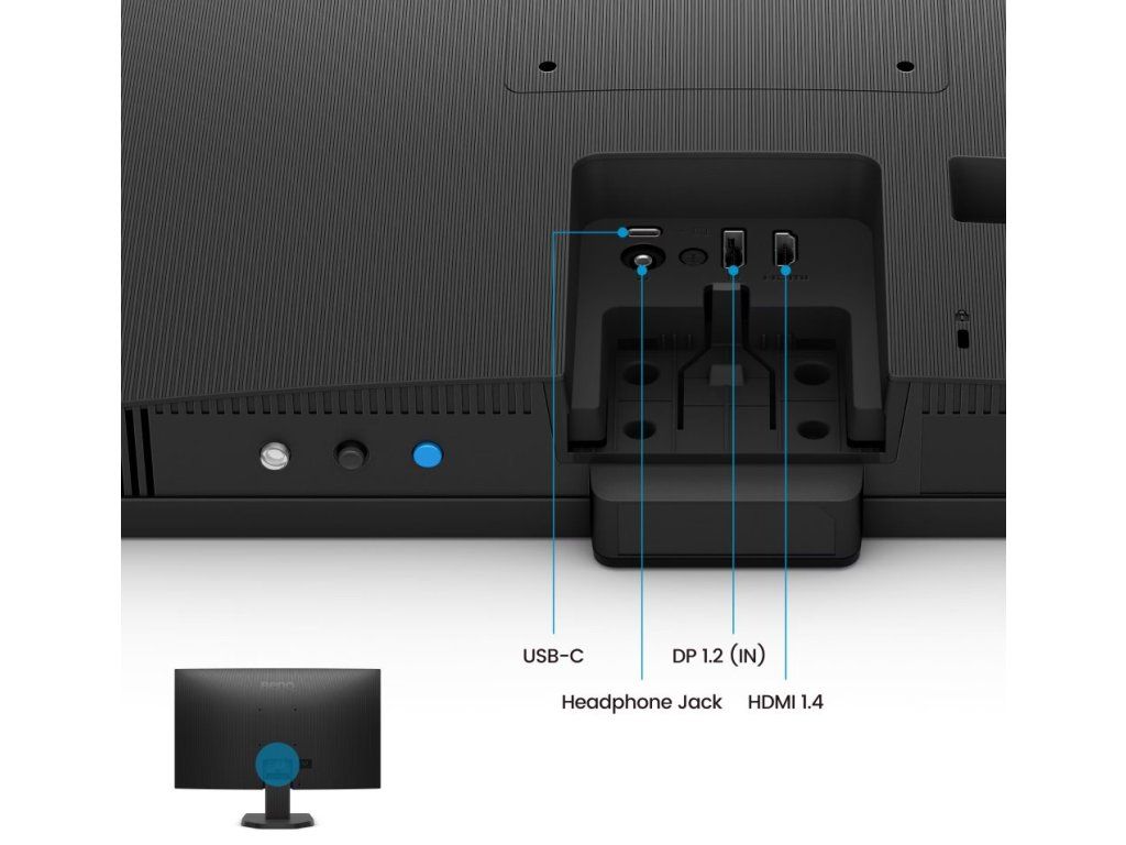 Kompletní konektivita zahrnuje HDMI 1.4, DisplayPort 1.2 a USB-C s podporou DisplayPort Alt Mode pro přenos obrazu a dat. Monitor disponuje integrovanými reproduktory 2 × 2 W a konektorem pro sluchátka. Náklon -5° až +20° umožňuje nastavení optimálního úhlu pohledu. Podpora VESA 100 × 100 mm zajišťuje možnost montáže na stěnu.