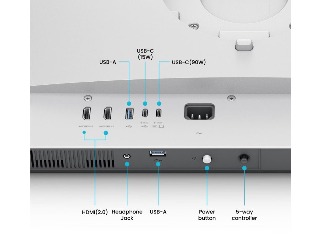 Monitor funguje jako kompletní dokovací stanice s portem USB-C (90 W Power Delivery) pro nabíjení a přenos dat, dalším USB-C portem (15W) a dvěma USB-A porty (7,5W). Dva porty HDMI 2.0 umožňují připojení více zařízení současně.