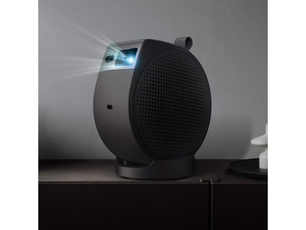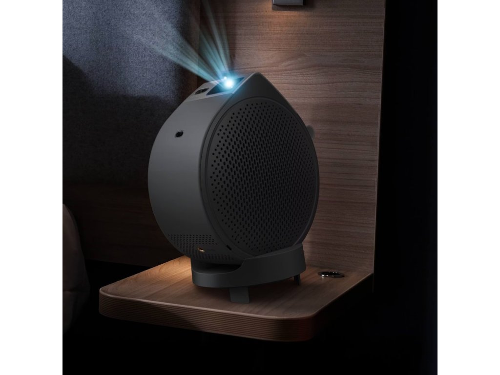 Mobilní projektor určený pro projekci na strop s flexibilním nastavením úhlů a vestavěnou baterií.