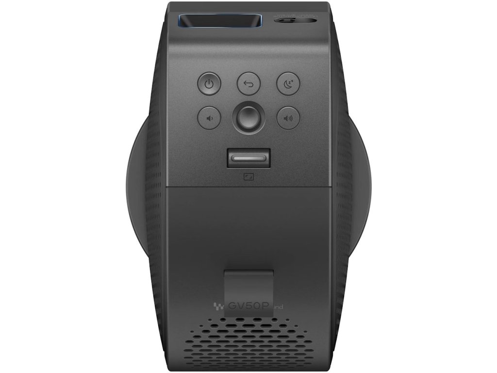Projektor BenQ GV50P nabízí unikátní design s nastavitelnou základnou připomínající trojnožku, která umožňuje projekci na strop přímo nad postelí. Díky možnosti svislého naklonění v rozsahu 135° a otočení o 180° můžete snadno přepínat mezi projekcí na stěnu a strop. Zařízení poskytuje Full HD rozlišení 1920 × 1080 px s jasem 500 ANSI lumenů a laserovým zdrojem světla s životností až 30 000 hodin v režimu ECO.