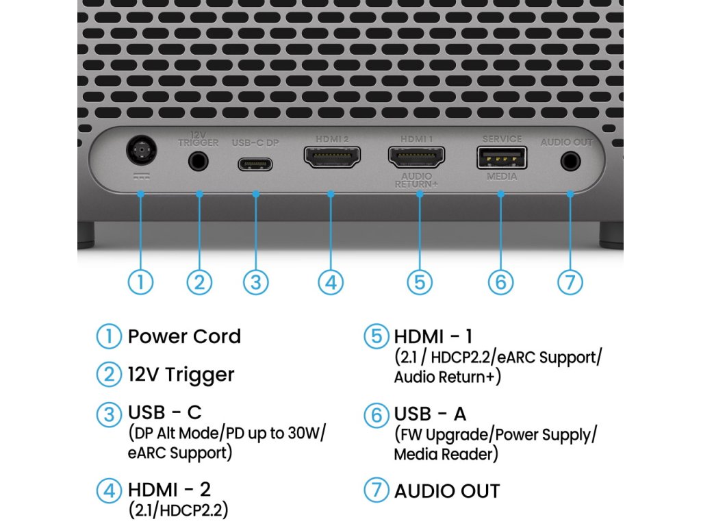 Konektivita: Wi-Fi (802.11a/b/g/n/ac/ax), Bluetooth 5.2, 2× HDMI, 1× USB, 1× USB-C (PD 30 W), 1× 12V trigger, 1× 3,5mm audio výstup