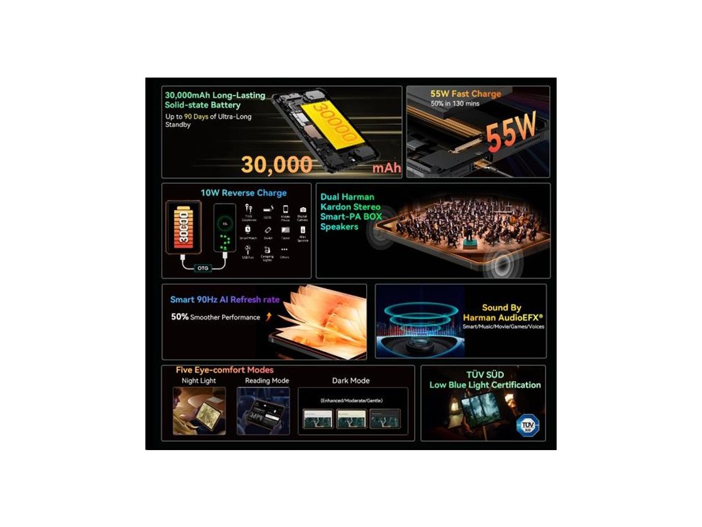 30000 mAh bateria s 90 dn Standby modom, 55W Fast Charge, Android 14 s updatom na 15,