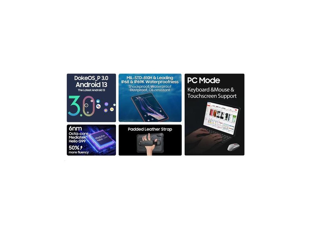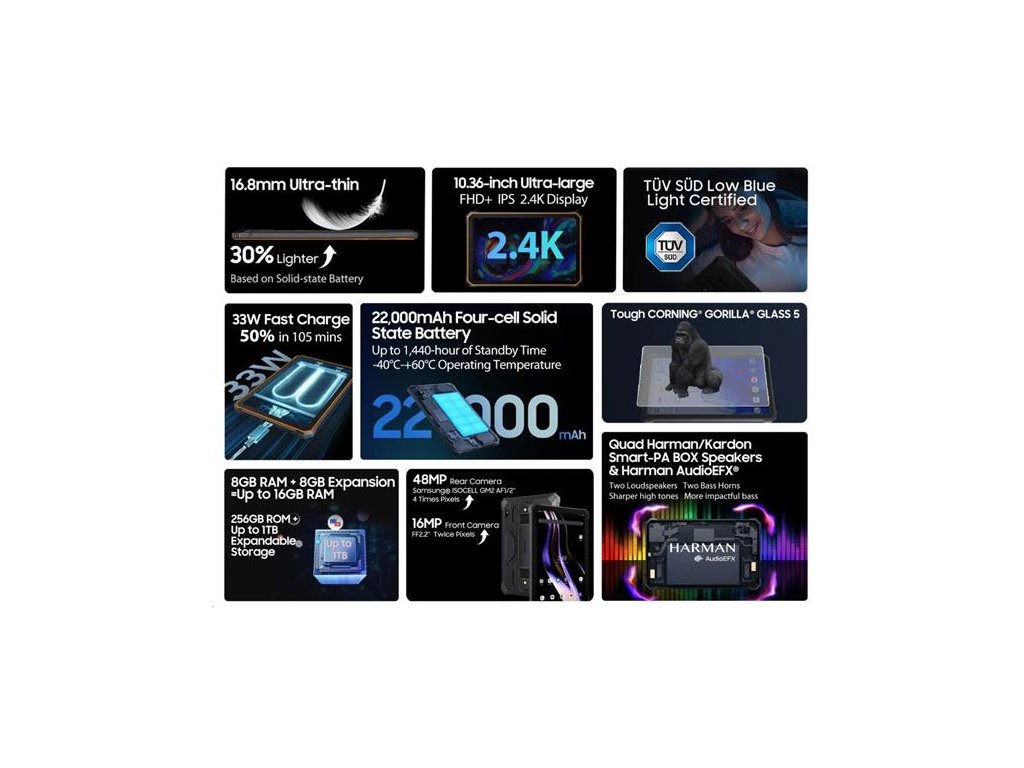Tablet Blackview Active 8 sa ujme role pomocníka, ktorého vďaka kompaktným rozmerom prenesiete v rukách alebo napríklad v menšej taške. Dovolí vám sledovať dianie na internete, nahrávať videá a robiť fotografie, ale aj pracovať s aplikáciami alebo hrať hry. Tablet je vybavený 10,36" displejom, ktorý je vhodný na použitie na pracovné aj študijné účely. Obľúbili si ho aj priaznivci hier i milovníci filmov. Všetky operácie a funkcie spravuje 8-jadrový procesor T616. Veľkosť operačnej pamäte je 6 GB. Potrebné množstvo energie poskytuje batéria s kapacitou 22000 mAh. Iste vás zaujme svojou konektorovou výbavou USB-C. Ponúkaný tablet zvládne náročné situácie bežného života vďaka svojej vodoodolnosti. Jeho ochrana je označená stupňom krytia IP68 a IP69K.Kľúčové vlastnosti tabletu Blackview Active 8