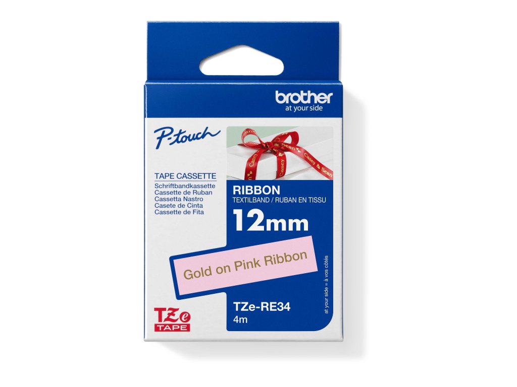 Originální kazeta Brother TZe-RE34 - zlatá na růžové, šířka 12 mm. Využijte své tvořivosti a vytvořte originální dárky pomocí originální pásky Brother TZe-RE34. S TZe-RE34 se můžete spolehnout na rychlý a spolehlivý tisk. Kompatibilní s tiskárnami štítků P-touch, které zobrazují logo TZ nebo TZe na krytu kazety s páskou. Vlastnosti *Šířka 12 mm, délka 4 m *Textilní stuha na dárky a tvoření *Vysoce kvalitní kazeta Brother *Zajistěte trvanlivé, snadno čitelné výsledkyDodatočné parametre