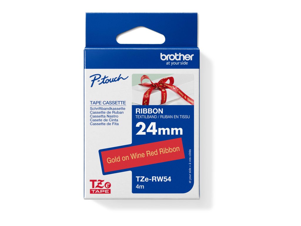 Originální pásková kazeta Brother TZe-RW54 - zlatý tisk na vínově rudé, šířka 24 mm Zapojte svou fantazii osobním přístupem k dárkům, kartám a řemeslným výrobkům pomocí originální pásky Brother TZe-RW54. S TZe-RW54 se můžete spolehnout na rychlý a spolehlivý výstup a na ostrý a profesionální standard tisku. Kompatibilní s tiskárnami štítků P-touch s logem TZ nebo TZe na krytu kazety s páskou. *Šířka 24 mm, délka 4 m *Textilní stuha na dárky a řemeslné výrobky *Snadno čitelné výtisky Tato textilní stuha bez lepící vrstvy s luxusním lesklým povrchem je ideální pro balení dárků a řemeslných výrobků.Dodatočné parametre