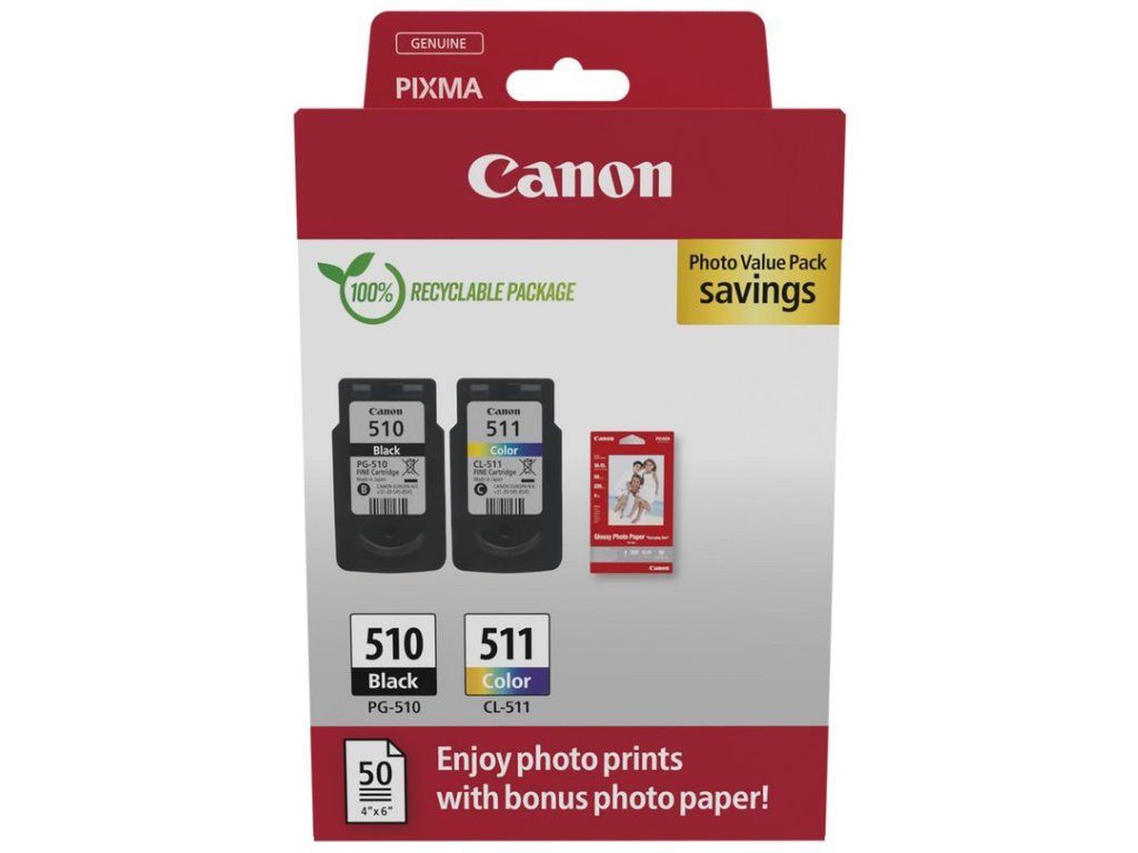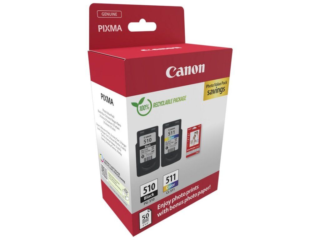 Canon PG-510/CL-511 + fotopapírVýhodné balení inkoustových náplní PG-510 (černá), CL-511 (azurová, purpurová, žlutá) a 50 listů fotografického papíru GP-501 ve formátu 10 × 15 cm.