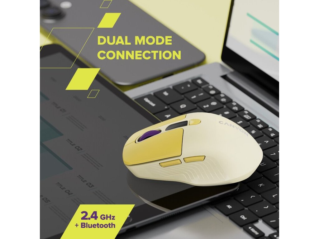 Canyon MW-26, 2v1 bezdrôtová optická myš Bluetooth / 2.4 GHz, tichá, 6 tlačidiel, 800/1200/1600/2400 DPI, žltá CNS-CMSW26Y