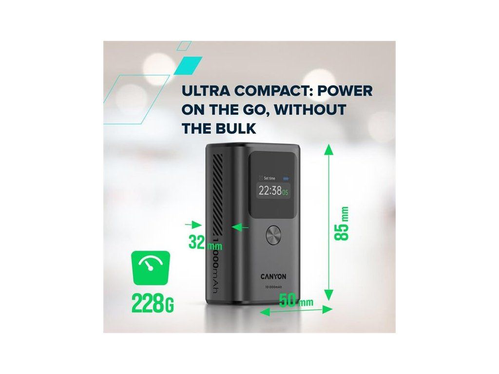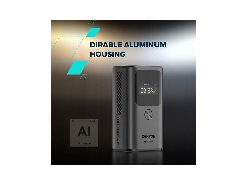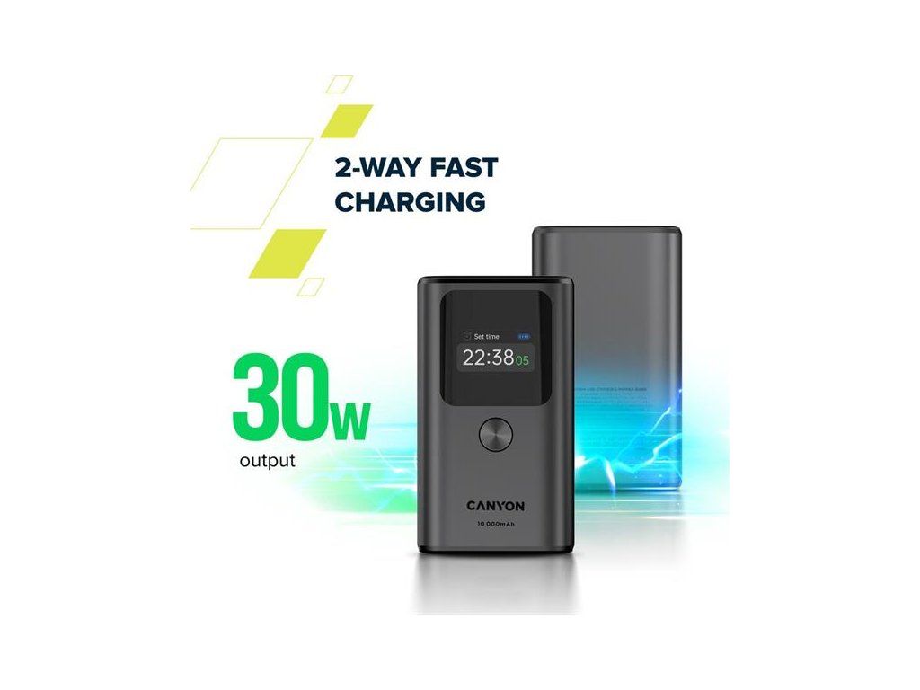 Canyon OnPower 130, Powerbank, 10.000 mAh, displej, in: USB-C, out: 2x USB-C /USB-A, 30W, hodiny/budík/teplomer CNS-CPB130DG