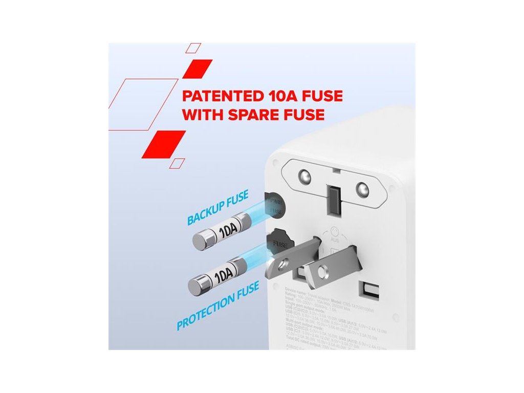 - Patentovaná certifikovaná poistka 10A (v súlade s BS1362) a náhradná poistka