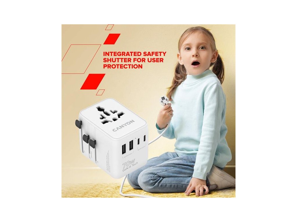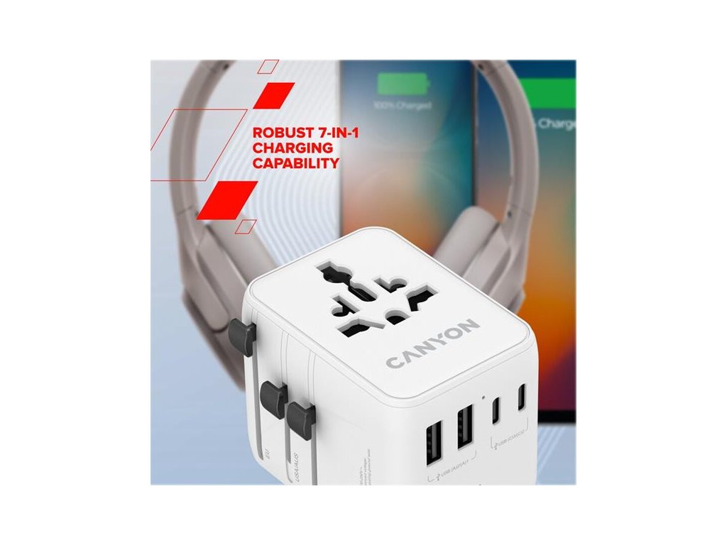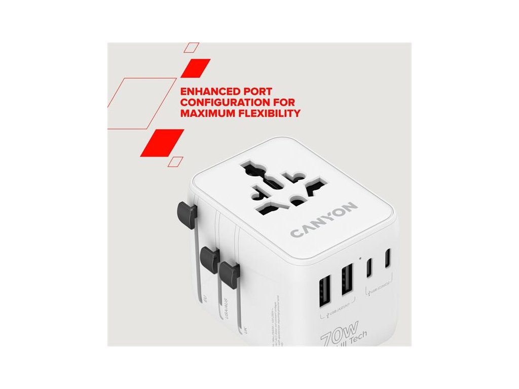 Canyon OnTour 70, univerzálny cestovný adaptér pre 200 krajín, 70W, 3x USB-C / 2x USB-A CNS-TA70W1006W
