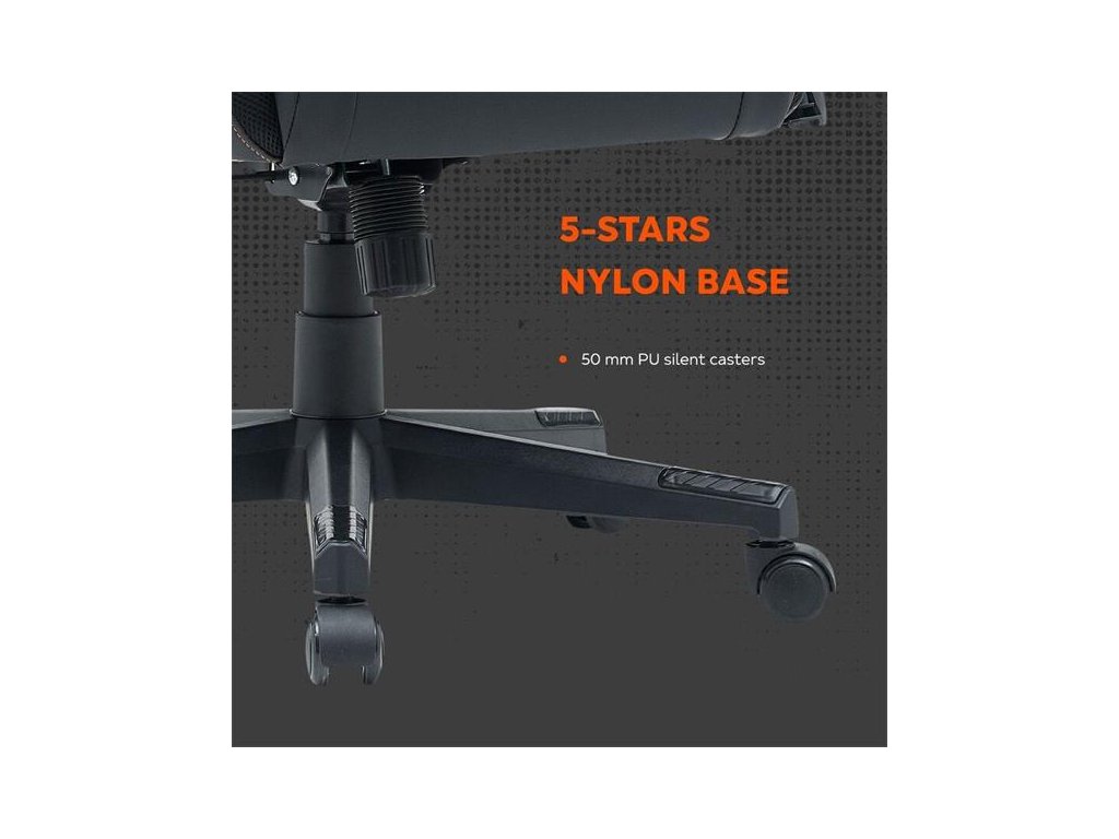 Päťcípa nylonová základňa je vybavená tichými 50 mm kolieskami, ktoré vám umožnia kĺzať sa po priestore ticho a pripravené na akciu. Plynové zdvíhanie triedy 4 dodáva dodatočný odraz, ktorý vám umožní nastaviť stoličku bez námahy do ideálnej výšky. Perfektne umiestnená opierka hlavy, bedrová opierka a vankúše podopierajú váš krk a spodnú časť chrbta, aby vás pri hraní nič nebolelo.