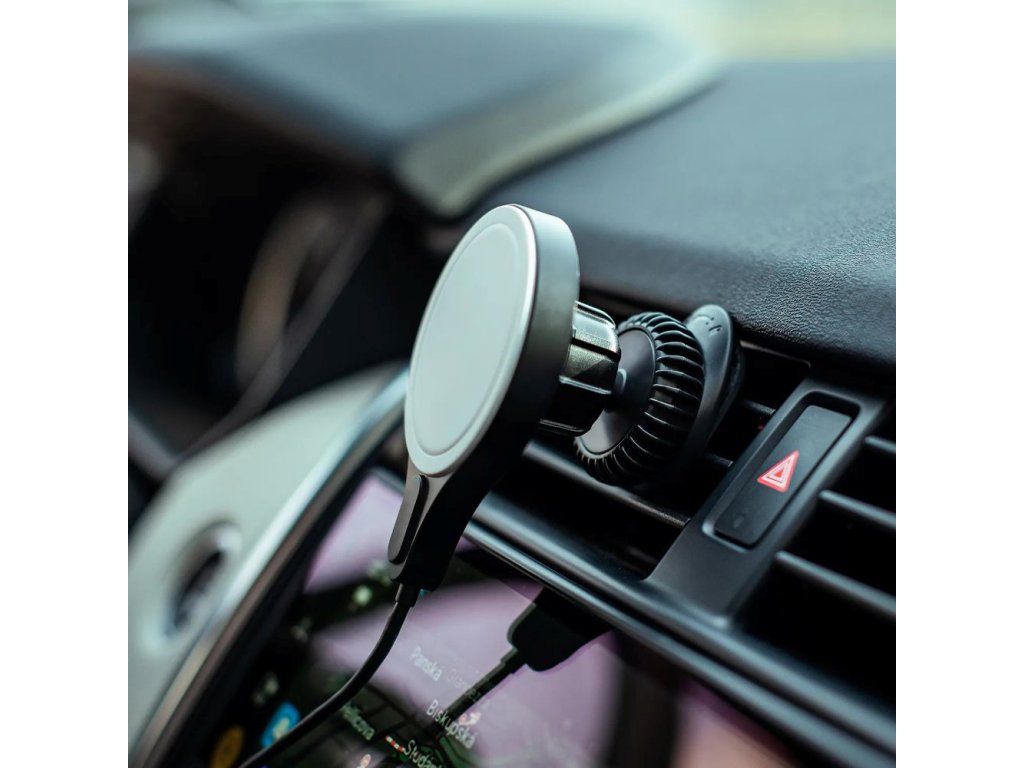 ER POWER MagSafe nabíjecí držák 15W - Černá Nabíjecí držák do ventilace auta s MagSafe, výkonem 15W a integrovaným USB-C kabelem v délce 1,5 m. Made for MagSafe Made for MagSafe certifikovaný nabíjecí držák do auta ER POWER poskytne zařízením iPhone 12 a novějším nabíjení výkonem 15W. Silné certifikované magnety udrží zařízení na svém místě i při projížďkách náročným terénem. Integrovaný USB-C kabel Integrovaný 1,5 metru dlouhý kabel vám umožní pohodlné zapojení do nabíječky v zásuvce auta. Promyšlené provedení Promyšlený způsob ukotvení pasuje do jakékoliv ventilace v automobilu. Díky možnosti utahování za pomoci šroubu držák vždy perfektně ukotvíte. Horizontální i vertikální nabíjení Své zařízení můžete na nabíječce nabíjet jak ve vertikální, tak v horizontální poloze. Klíčové vlastnosti Made for MagSafe Výkon až 15W 1,5m integrovaný USB-C kabel Vyrobeno pro: Apple iPhone 15/15 Plus/15 Pro/15 Pro Max/14/14 Plus/14 Pro/14 Pro Max/13/13 Mini/13 Pro/13 Pro Max/12/12 Mini/12 Pro/12 Pro Max/Airpods/Airpods 3. gen. s MagSafe Technické parametry příkon: min. PD 20W výkon: max. 15W Součástí balení je také 40W adaptér.Dodatočné parametre