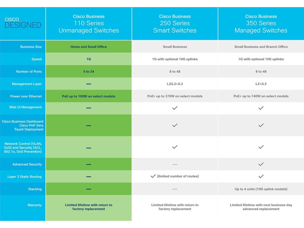 Tento prvek nahrazuje SG110-16-EU Nyní můžete mít vysoce výkonnou síť podnikové třídy s Cisco Business 110 Series Unamnaged Switches. Tyto cenově dostupné přepínače typu plug-and-play jsou ideální pro malé kanceláře, pracovní skupiny, oddělení a rostoucí kanceláře s omezeným IT know-how a podporou. Poskytují robustní síťové připojení, které splňují vaše obchodní požadavky, a také přidanou spolehlivost s pokročilými funkcemi, jako je Quality of Service (QoS), detekce smyčky a diagnostika kabelů, to vše v přepínači, který si můžete nastavit sami během několika minut. Přepínače řady Cisco Business 110 přinášejí vaší malé firmě osvědčenou spolehlivost a ochranu investic síťových řešení Cisco. Technické parametry *Kapacita v milionech paketů za sekundu: 23,8 mpps *Přepínací kapacita v gigabitech za sekundu: 32 Gb/s *Tabulka MAC: 8K *Jumbo frame: 9216 bytes *Quality of Service (QoS): 802.1p priority based, 4 hardware queues, priority queuing and Weighted Round-Robin (WRR) *Detekce smyčky: Pomáhá objevovat smyčky v síti, aby nedocházelo k vysílacím bouřím *Diagnostika kabelů: Rychle identifikujte a odstraňujte poruchy nebo zkraty síťových kabelů *Rozhraní závislé na médiu: Automatic Media Dependent Interface (MDI) a MDI crossover (MDI-X) *Standardy: IEEE 802.3 10BASE-T Ethernet, IEEE 802.3u 100BASE-TX Fast Ethernet, IEEE 802.3ab 1000BASE-T Gigabit Ethernet, IEEE 802.3z Gigabit Ethernet, IEEE 802.3x Flow Control, 802.1p priority, Energy Efficient Ethernet, 802.3af, Power over Ethernet *Porty: 16 x Gigabit Ethernet *Typ kabeláže: Kategorie 5e nebo vyšší *Možnosti montáže: Stolní, nástěnný nebo stojanový *Fyzický bezpečnostní zámek: Slot pro zámek Kensington *Flash: 16 MB *CPU: 400 MHz ARM *CPU memory: 128 MB *Paketová vyrovnávací paměť: 2 Mbit *Ventilátor: Ne *Rozměry (Š x H x V): 279 x 170 x 44 mm *Hmotnost: 1,33 kg *Provozní teplota: 0 - 50°C Obsah balení: - Cisco Business 110 switch - napájecí kabel nebo adaptér - montážní sada - instalační příručka Držáky do racku jsou součástí balení.Dodatočné parametre