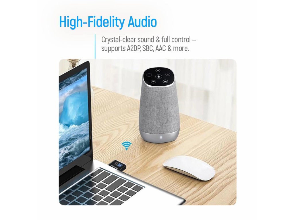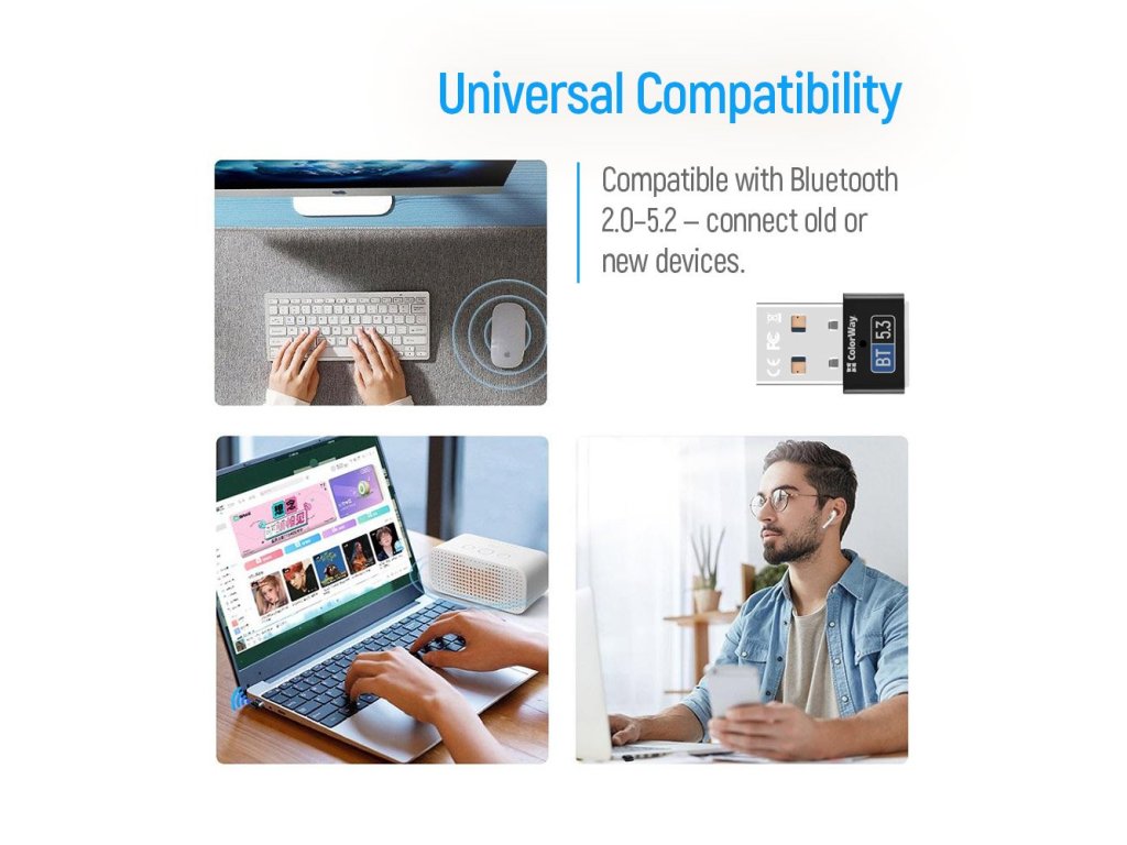 Adaptér vyniká zpětnou kompatibilitou s verzemi Bluetooth 2.0 až 5.2, takže funguje se zařízeními všech generací. Díky funkci Plug & Play pro Windows 8.1 a novější není potřeba instalovat žádné ovladače.