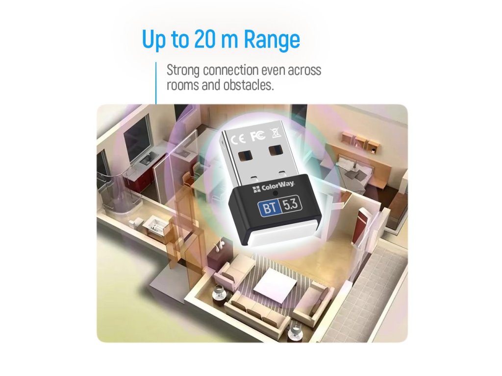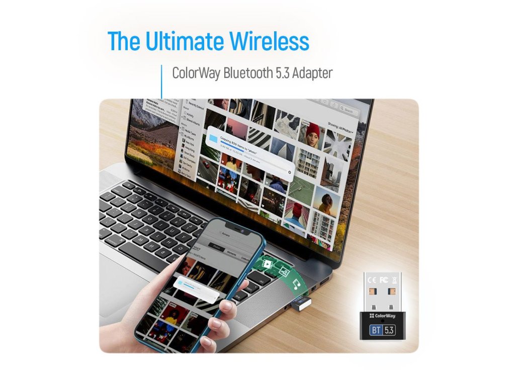USB adaptér ColorWay Bluetooth 5.3 USB, se kterým obohatíte váš PC systém o bezdrátovou konektivitu Bluetooth. Pokud vaše výpočetní zařízení nedisponuje rozhraním Bluetooth, ale současně potřebujete připojit bezdrátová sluchátka, myš nebo klávesnici, stačí vám jen volný port USB a tento malý pomocník ColorWay. Adaptér podporuje bezdrátové připojení pomocí technologie Bluetooth 5.3, která zajištuje silný signál pro stabilní připojení bez výpadků.