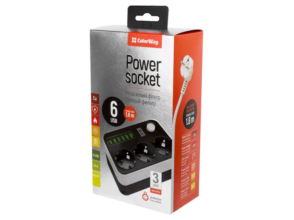 ColorWay CW-CHE36BKompaktní prodlužovací přívod se třemi síťovými zásuvkami 220 V a šesti porty USB 5 V. Můžete s ním tedy připojit nejen elektrické spotřebiče, ale současně nabíjet až 6 mobilních zařízení z portu USB. Přívod také automaticky rozpozná typ připojeného zařízení a sám určí nejlepší nabíjecí proud připojeného zařízení od 0,1 do 2,4 A.