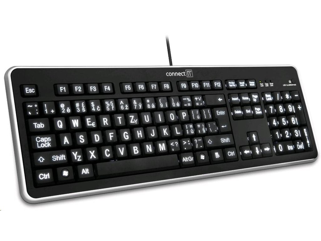 Novú klávesnicu CONNECT IT s LED podsvietením a veľkým písmom ocenia nielen používatelia so slabším zrakom, ale aj všetci, ktorí pracujú v tme a vo večerných hodinách. Čierna povrchová úprava so strieborným lemovaním dodáva klávesnici elegantný vzhľad. Vlastnosti: - české rozloženie kláves - veľké písmo kláves pre pohodlné písanie - biele LED podsvietenie pre použitie za svetla aj v tme - tlačidlo na vypnutie podsvietenia - matný povrch klávesnice - kompatibilná s USB 1.1 a 2.0 - dĺžka kábla: 140 cm.Dodatočné parametre