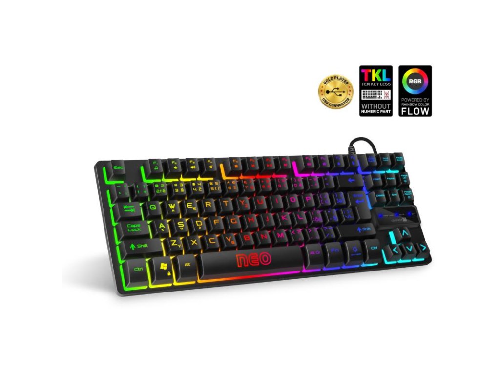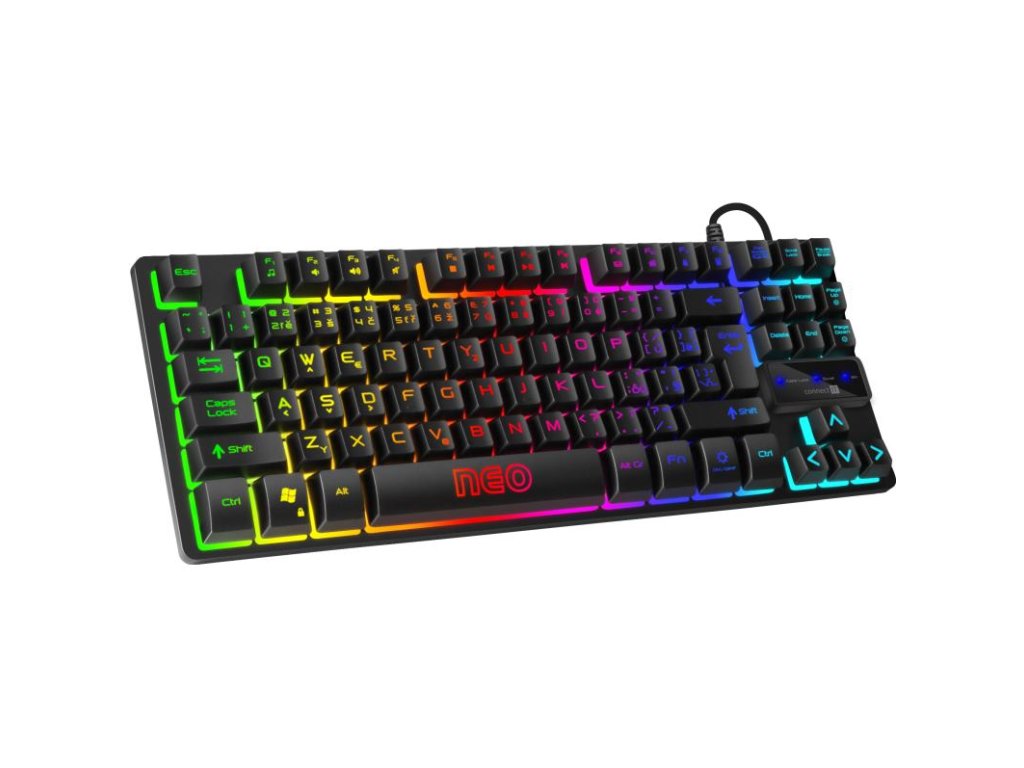 Profesionálna herná klávesnica NEO Compact BLACK je ideálnou voľbou pre hráčov, ktorí si cenia efektivitu a priestor na stole. Jej unikátny TKL (TenKeyLess) dizajn bez numerickej časti poskytuje viac miesta pre voľný pohyb myši, čo je pri intenzívnom hraní kľúčové. Klávesnica má české a slovenské rozloženie klávesov a ponúka štýlové dúhové podsvietenie, ktoré si môžete prispôsobiť podľa svojich preferencií.