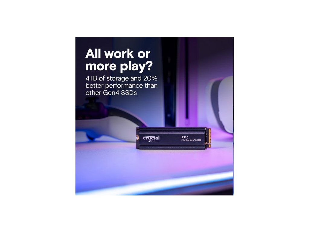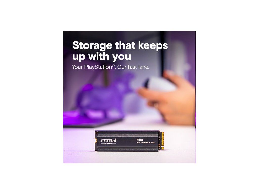 Crucial P310 2280 NVMe SSD Game on. Limit off. Let the powerful Crucial P310 NVMe SSD deliver your next win Faster gameplay and bootups Crucial P310 2280 NVMe with game controller image Easy to install Built-in heatsink fits perfectly into Playstation®5 and PlayStation®5 Pro?? Automatically detected once installed Crucial P310 2280 NVMe with game console and accessories Built for unthrottled performance and PS5 gaming Heatsink design ensures your drive never slows down because of heat?? Playstation®5 and PlayStation®5 Pro compatible ??20% better performance than other Gen4 SSDs7 Crucial P310 2280 NVMe product image with design background Speed you need for PS5 or PC Blazing fast sequential reads up to 7,100MB/s1?? Beats 5,500MB/s PS5 speed requirement?? 2x faster® than previous generation Crucial P310 2280 NVMe image All work or more play? Faster bootups, file transfers, and game loads?? More speed running Adobe Photoshop, Illustrator, Microsoft Excel, and Powerpoint Typical I/O performance numbers as measured using CrystalDiskMark® with command queue full and write cache enabled. Fresh out-of-box (FOB) state is assumed. For performance measurement purposes, the SSD may be restored to FOB state using the secure erase command. System variations will affect measured results. Some of the storage capacity is used for formatting and other purposes and is not available for data storage. 1GB equals 1 billion bytes. Speed comparison is between Crucial P310 published top speeds of 7,000MB/s and the fastest published Gen3 speeds for NVMe SSDs, at 3,500MB/s. Your speed may vary. Micron reserves the right to transition between NAND series during future production cycles. Warranty valid for five years from the original date of purchase or before writing the maximum total bytes written (TBW) as published in the product datasheet and as measured in the product’s SMART data, whichever comes first. Based on PCMark 10® Benchmark test results comparing the Crucial P310 to Samsung 990 EVO and WD SN580 SSDs. Your performance may vary. Based on 3DMark Benchmark test results comparing the Crucial P310 to Samsung 990 EVO and WD SN580 SSDs. Your performance may vary. Power-to-performance comparison measured between 1TB+ Crucial P3 Plus and P310 PCIe® 4.0 NVMe SSDs. Your performance may vary. Speed comparison is between Crucial P310 published top speeds of 7,100MB/s and published competitor NVMe Gen4 SSD speeds. Your performance may vary. Specifications General tech specs SSD Series P310 Interface NVMe (PCIe Gen 4 x4) Total Density 2TB Kit Quantity 1 Form Factor M.2 (2280) SSD Endurance TBW 440TB Speed & timing Sequential Write 6000 MB/s Sequential Read 7100 MB/s Warranty & returns Warranty Description Crucial offers different warranty levels for different products.Dodatočné parametre