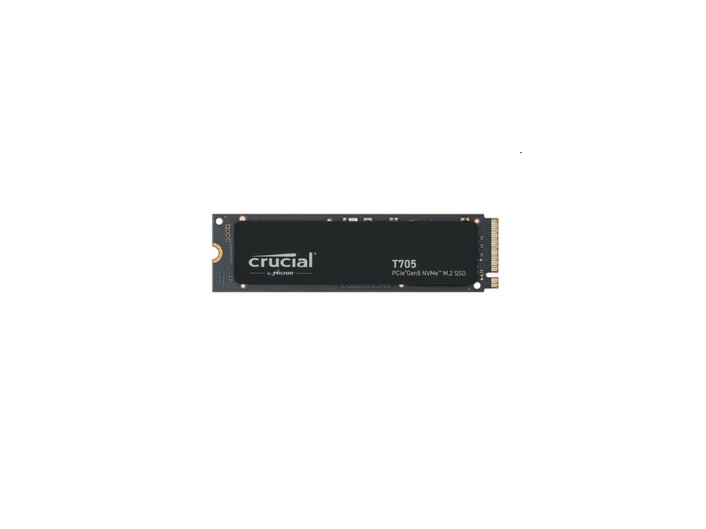 BETTER. FASTER. STRONGER. With cutting-edge 232-layer NAND, the Crucial T705 Gen5 SSD gives you an edge in gaming performance and content creation workloads. Blur the line between virtual and reality Blistering speed Outperforms5 yesterday's fastest SSDs without greatly increasing power consumption Crucial T705 SSD with system image Crucial’s best-in-slot Gen5 gaming SSD Load AAA games up to 15% faster9 with DirectStorage Unlock the potential for more detailed textures9 Enjoy faster gameplay and sharper graphics9 Crucial T705 SSD installation image No-compromise premium heatsink Aluminum and copper design Maximum heat dissipation4 No noisy fans or liquid cooling Non-heatsink option1 available Crucial T705 SSD gamer and package image Revolutionary speed meets compatibility Works with Intel® Core 13-14th Gen CPUs Works with AMD Ryzen™ 7000 series CPUs Powerful performance for AI apps and more Backward compatible with Gen3 and Gen4 systems. 1. Non-heatsink versions of the Crucial T705 must be installed with a motherboard or alternate heatsink to achieve optimal performance. 2. Typical I/O performance as measured using CrystalDiskMark® with a queue depth of 512 and write cache enabled. Windows 11 Core isolation disabled for performance measurement. Fresh out-of-box (FOB) state is assumed. For performance measurement purposes, the SSD may be restored to FOB state using the secure erase command. System variations will affect measured results. 3. See Micron.com/products/nand-flash for more information. 4. Under typical conditions for airflow and ambient temperature, our pre-installed premium heatsink allows the T705 Gen5 SSD to run at max workload without the need to thermal throttle. Comparisons made to SSD temperatures without a cooling apparatus. Please ensure your drive has proper airflow for maximum performance. 5. Compared to Crucial T500 Gen4 NVMe® SSD listed speed of 7,400MB/s. Actual speed may vary. 6. Some storage capacity is used for formatting and other purposes and is not available for data storage. 1GB equals 1 billion bytes. 7. Compared to Gen5 SSD performance without DirectStorage, based on internal test results with supported GPU that uses GPU decompression. 8. Compared to Crucial MX500 SATA SSD listed speed of 560MB/s. Actual speed may vary. 9. Fresh-out-of-box (FOB) performance measured with a typical Microsoft workload compared to the FOB average performance of Micron 3400 & 3500 SSDs with similar workloads. 10. Warranty valid for 5 years from the original date of purchase or before writing the maximum total bytes written (TBW) as published in the product datasheet and as measured in the product’s SMART data, whichever comes first. 11. One-month complimentary Adobe® Creative Cloud personal All Apps plan available with eligible Crucial SSD purchase. Adobe Creative Cloud ID and Crucial product registration required for redemption. Eligible Crucial T705 SSDs: CT1000T705SSD3, CT2000T705SSD3, CT4000T705SSD3, CT1000T705SSD5, CT2000T705SSD5, CT4000T705SSD5 or CT2000T705SSD5A must be purchased between March 12 and December 31, 2024. Offer limited to one redemption per eligible Crucial SSD purchase and registration; up to two per Adobe Creative Cloud user account, subject to acceptance of applicable Terms of Use, while activation code supplies last. Additional terms and conditions may apply. Micron Technology reserves the right to change or discontinue this offer at any time without notice. 12. To ensure optimal performance and maintain your T705 SSD’s warranty when installing with an in-motherboard heatsink, you must not remove the copper-clad label. 13. Compared to an average of the bandwidth for Micron 3400 & 3500 SSDs. General tech specs SSD Series T705 Interface NVMe (PCIe Gen 5 x4) Total Density 4TB Kit Quantity 1 Form Factor M.2 (2280) SSD Endurance TBW 2400TB Speed & timing Sequential Write 12,600 MB/s Sequential Read 14,100 MB/s Random Write 1800K IOPS Random Read 1500K IOPS Warranty & returns Warranty Description Crucial offers different warranty levels for different products.Dodatočné parametre
