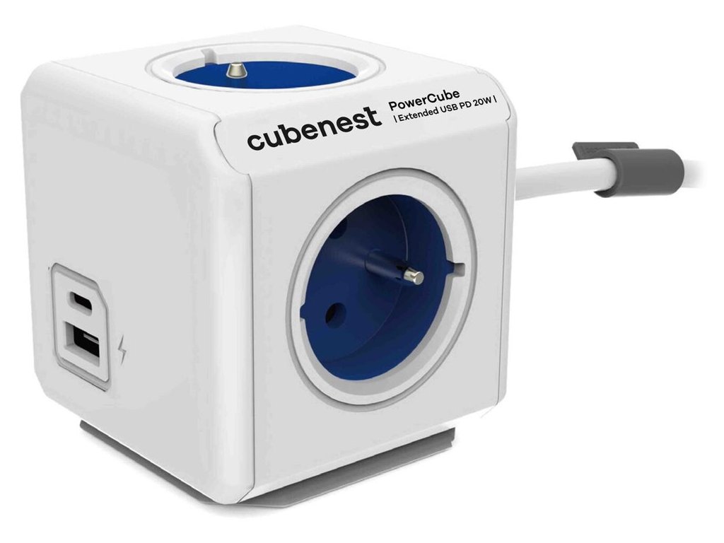 Cubenest Powercube Extended USB PD 20W, A+C, 4× zásuvka, 1,5m, bílá/modrá, dětská pojistka, uzemnění, dok, 10A/250V PC420BL