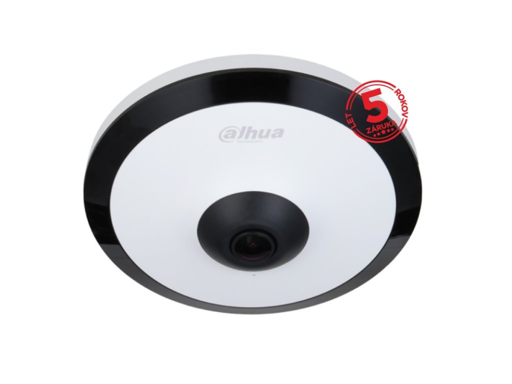 5 Mpx IR Fisheye IP kamera, Day/Night, IR prísvit s dosvitom 10 m, 1/2.7" 5Megapixel progressive CMOS, rozlíšenie 2592 × 1944 px, snímkovanie 25/30 fps, citlivosť 0,006 lx @ F2.0, pevný objektív 1,4 mm, uhol záberu H: 180°, V: 180°, D: 180°, AWB, WDR 120 dB, BLC, HLC, AGC, ROI, 3D DNR, kompresia H.265 / H.265+ / H.264 / H.264+ / H.264H / H.264B / MJPEG (podporované iba sub-streamom), Inteligentné Funkcie: IVS (Perimeter Protection), People Counting, Intelligent Search, Heat Map, ONVIF kompatibilné, vstavaný mikrofón, audio I/O 1/1, alarm I/O 1/1, RJ-45 (10/100 Base-T), Micro SD karta max. 256 GB, pracovná teplota od -10 °C do +50 °C, napájanie 12 V DC / PoE, spotreba 7,3 W (12 V DC), 8,8 W (PoE), rozmery ø 126,2 x 44,6 mm, hmotnosť 299 g