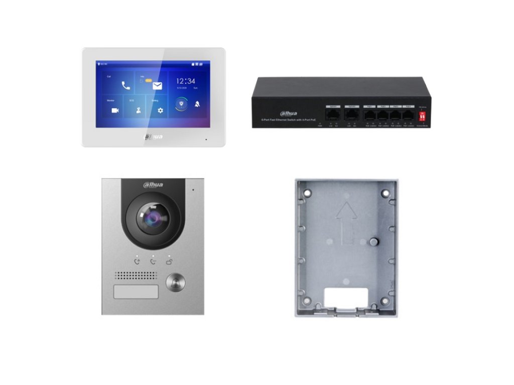 Dahua inštalačná sada TCP/IP, obsahuje monitor VTH5421HW, 7" farebný dotykový TFT displej s rozlíšením 1024 x 600 px, rozmery 189 x 130 x 27 mm, dverná jednotka VTO2201F-P, 1 mechanické tlačidlo, kamera 2MP CMOS, uhol záberu 140°, 1x ovládanie zámku, rozšíriteľné o druhý zámok cez DEE1010 (nie je súčasťou balenia), IP 65, rozmery 130 x 96 x 29 mm, montážna krabica VTM115, systémové napájanie cez PoE Switch PFS3006-4ET-36 (súčasť balenia), podpora náhľadu z Dahua kamier, volanie a odomknutie dverí cez mobilnú aplikáciu Dahua DMSS