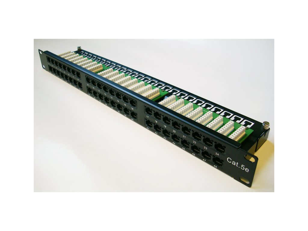 19'' UTP Patch panel DATACOM 48 port- 19'' Patch panel určený pro montáž do 19'' datových rozvaděčů- 6 x 8 pozic zářezového pole LSA krone- výška 1U- cat. 5e- horní zářez- včetně vyvazovacího panelu- barva černáDodatočné parametre