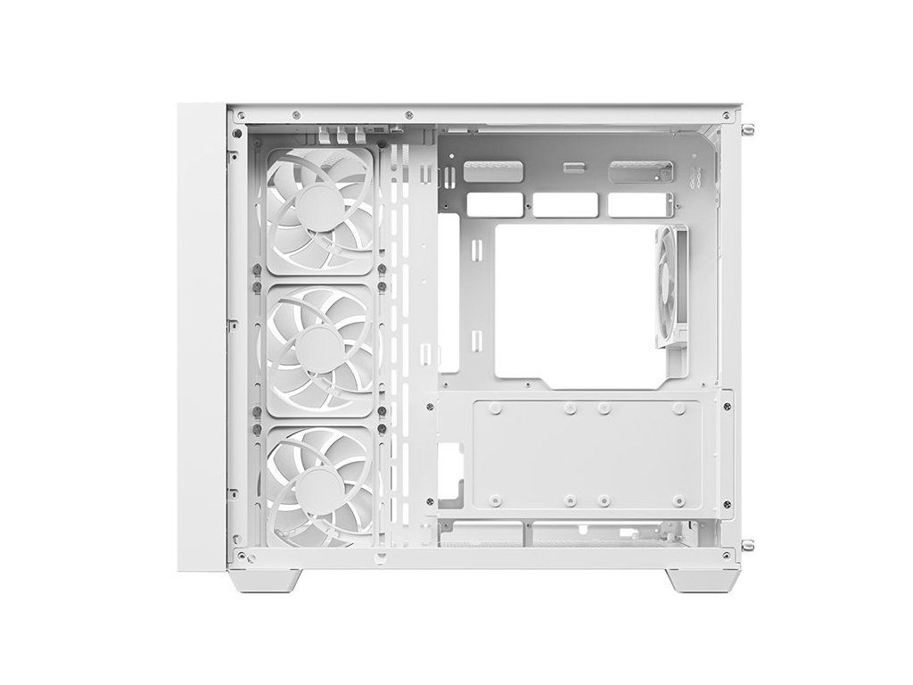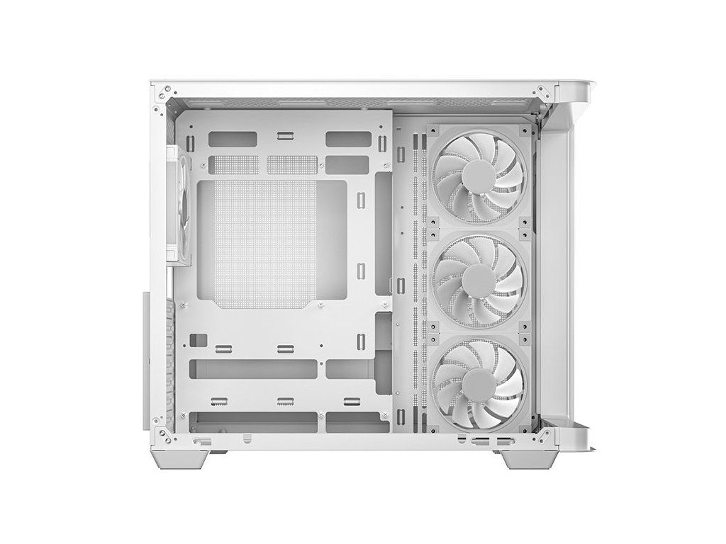Skříň je dodávána s předinstalovanými čtyřmi ARGB ventilátory – třemi jednotkami s reverzními lopatkami na boku a jedním standardním vzadu. Toto vyvážené uspořádání zajišťuje účinné chlazení s horizontálním prouděním vzduchu. Velkoryse dimenzovaný interiér podporuje CPU chladiče do výšky 160 mm, grafické karty do délky 410 mm a zdroje do délky 210 mm.